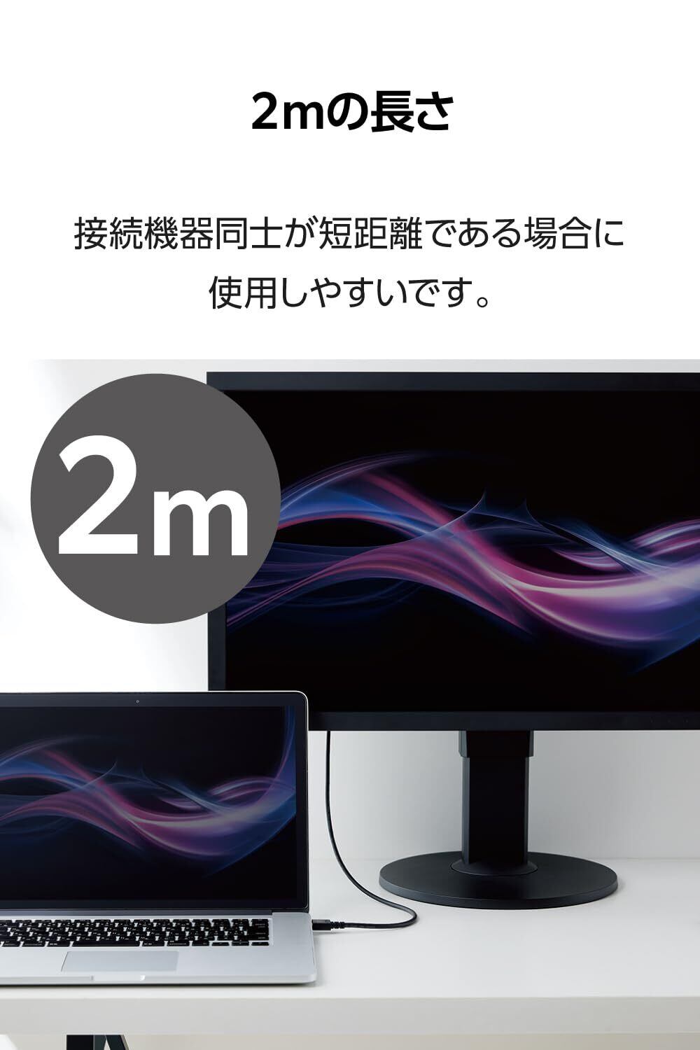 最大4K/60Hzの解像度に対応したHDMIケーブルです。High Speed HDMI Cable with Ethernet認証済みで、映像信号と音声信号に加え、100Mbpsのイーサネット通信を実現します。