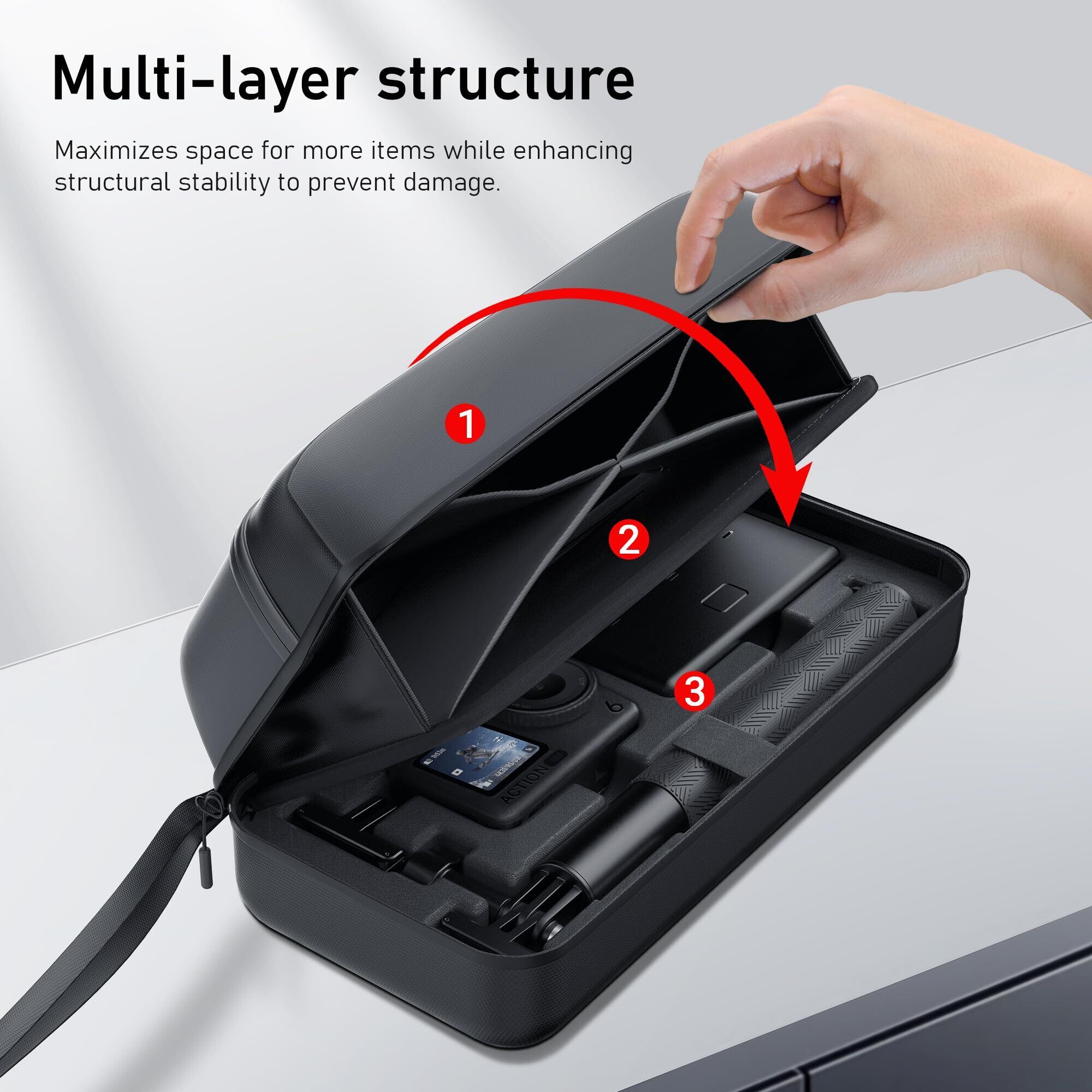 【多機能収納レイヤー】 action 6 キャリーバッグの上部収納スペースは、ケーブルやその他サードパーティ製アクセサリー専用に設計され、安全で信頼性の高い独立した収納エリアを提供します。Osmo Action 6 収納バッグは、ユニークな4区画仕切りデザインを採用し、様々なアクセサリーを整然と整理収納できます。