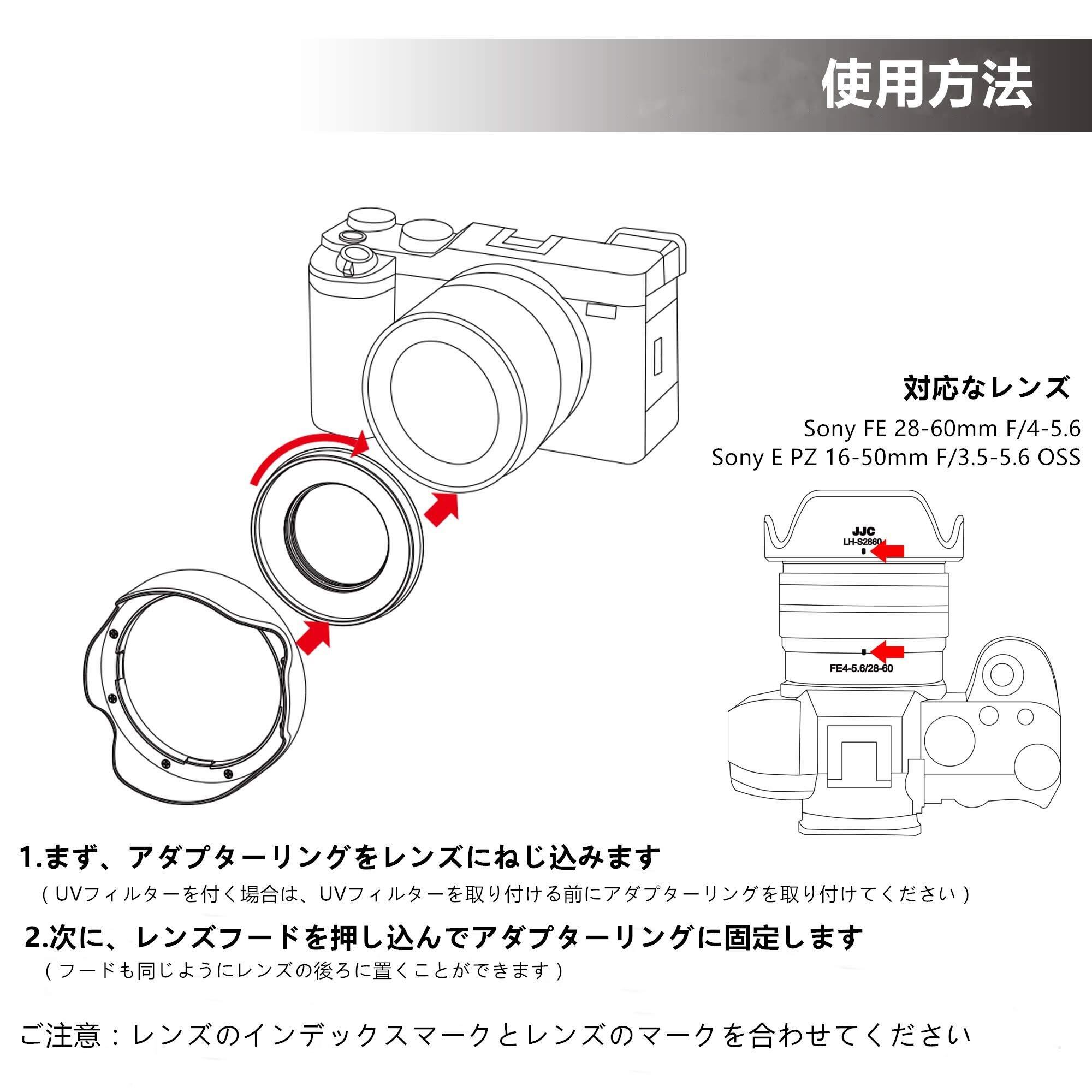 【人気商品】JJC 可逆式 レンズフード + アダプター リング ソニー Sony FE 28-60mm F4-5.6 (SEL2860) レンズ 対応 Alpha A7C と Sony E PZ 16-50mm F3.5-5.6 OSS (SELP1650) レンズ対応 ZV-E10 II ZV-E10 A6100 などカメラ適用 Ф40.5mm 保護フィルターとレンズキャップ ミラーレス インストール可能