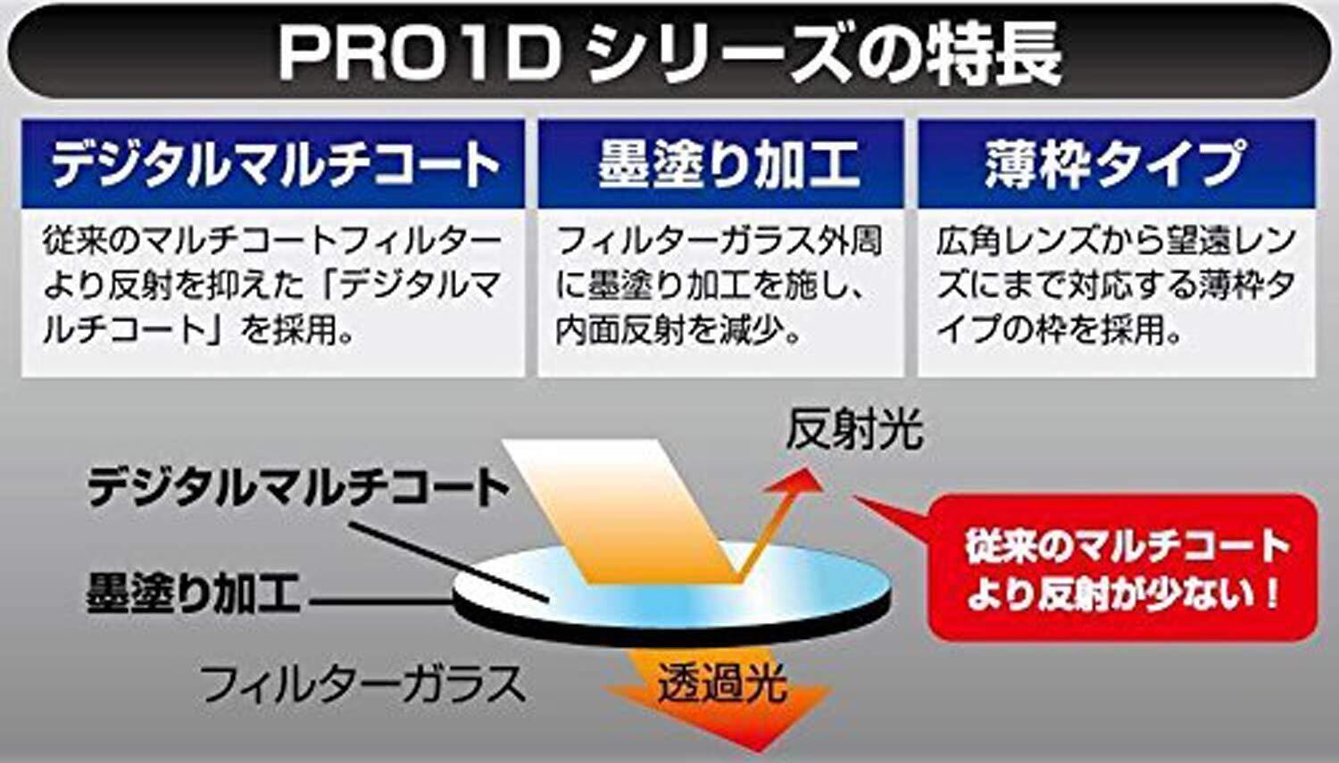「デジタル設計」として、新開発「デジタルマルチコーティング(DMC)」の採用、ガラス周囲の墨塗り加工等を施したレンズ保護フィルター。お手ごろ価格でハイクオリティーのものをお求めの方にピッタリなレンズ保護フィルターです。フィルムカメラ用にもご使用いただけます。 製品の特長 超軽量でワイドレンズに最適な薄枠タイプ。ガラスは通常のフィルターと同じ2mm厚ながら、機械加工技術の追求により、枠部分のみを薄くすることに成功。さらに薄枠ながらフィルター前部にネジを設けており、レンズキャップの取り付けが可能です。日本製 レンズフィルター 58mm / レンズプロテクター 58mm / レンズ保護フィルター 58mm