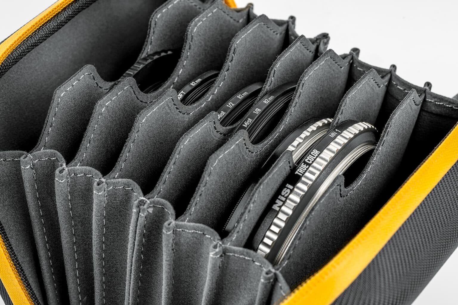 8つのコンパートメントであらゆるフィルターをコンパクトに収納します。旧モデルのジッパーを改良したことで耐久性が向上し、動きもスムーズになりました。