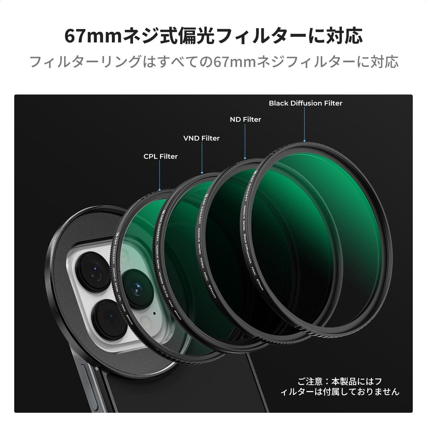 【新着商品】K&F CONCEPT スマホ用 フィルターケース 67mmネジ式フィルター 全対応 簡単装着 撮影 iP*one 16 / 15など (6.1/6.3インチ) に適用
