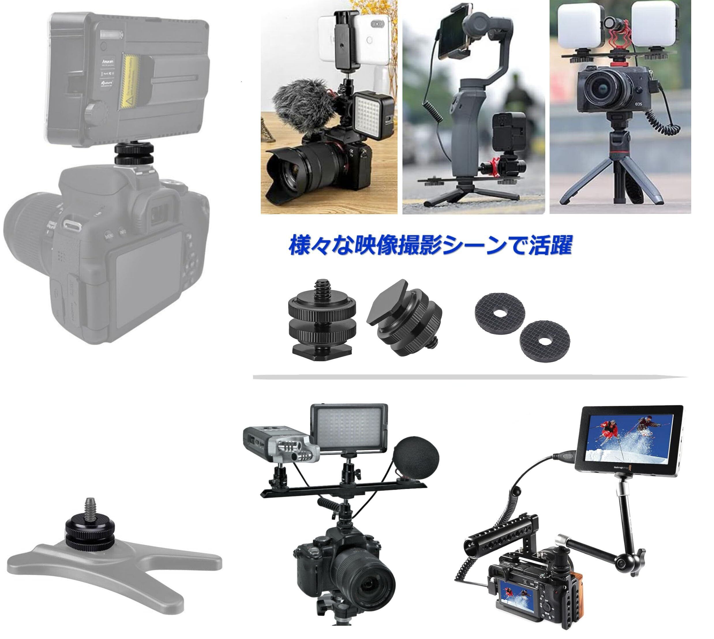 【様々な機材に対応】一眼レフ・ミラーレス カメラのホットシューや拡張ブラケット、カメラやスマホ用ビデオリグやゲージ、ライトスタンドのシューアダプタなどに1/4インチ仕様のカメラ・ビデオカメラ、撮影アイテム、延長ロッド、iPhone, Android 機種等のスマートフォン、マイク、LEDライト、音響機器やアイテムをセットして使用が出来ます。シューマウントアダプターとラバー製スペーサー・パッドのセット商品です。