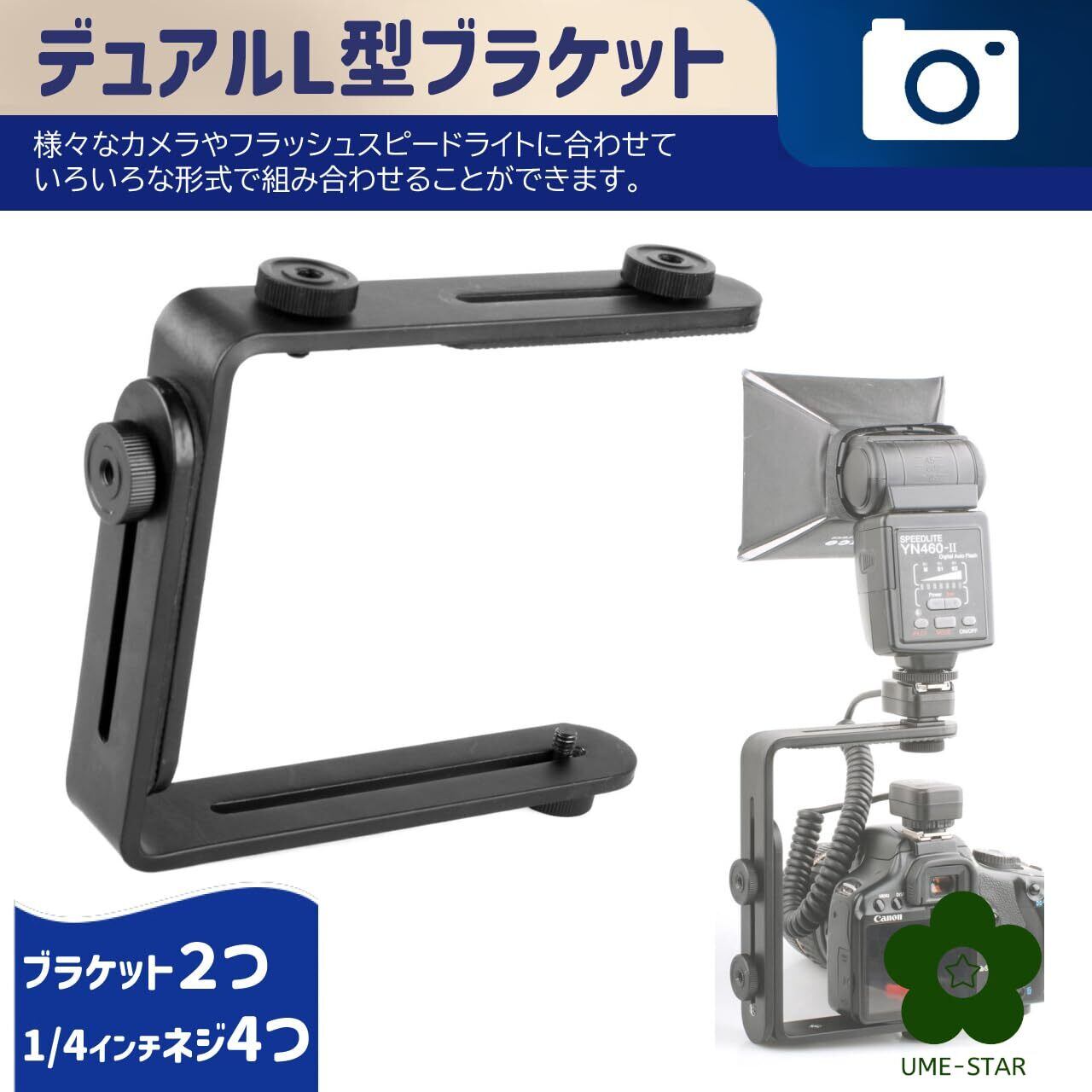 デュアルL型ブラケットは、様々なカメラやフラッシュスピードライトに合わせて、いろいろな形式で組み合わせることができます。 L型ブラケットが2つ(2種類)と1/4インチネジが4つ付属しており、カメラ、スピードライト、三脚、ライトスタンド、その他のアクセサリをマウントできます。