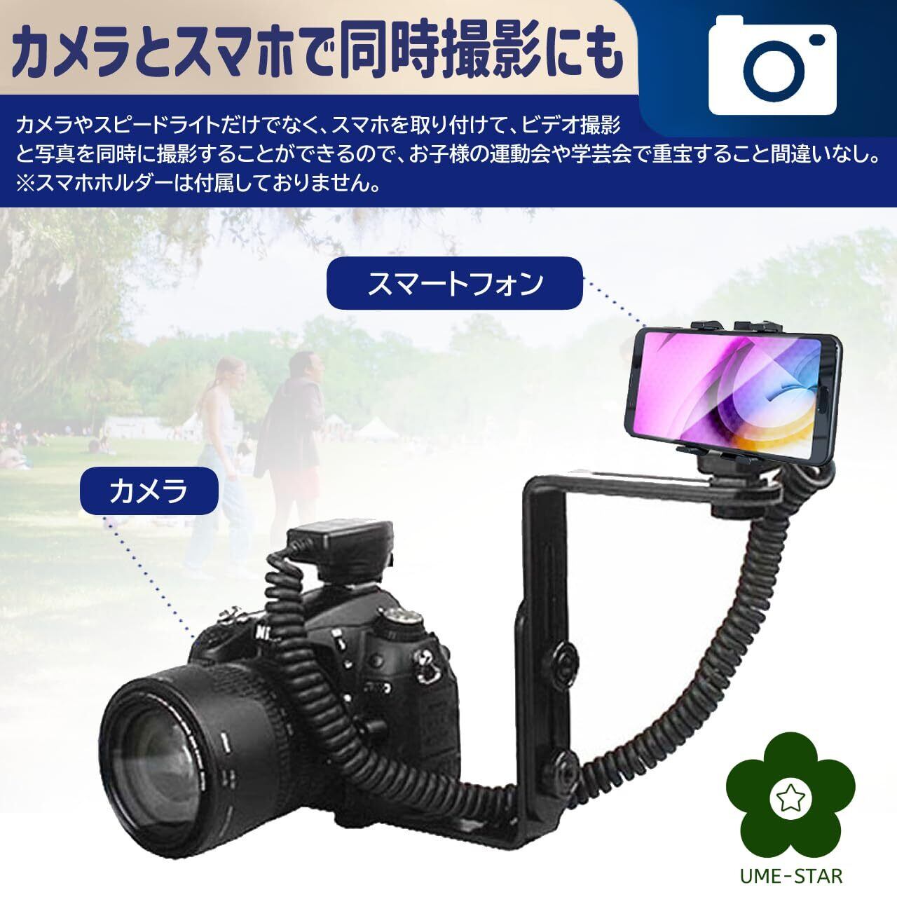 カメラやスピードライトだけでなく、スマホ(ホルダー装着、ホルダーは別売り)を取り付けて、ビデオ撮影と写真を同時に撮影することができるので、お子様の運動会や学芸会で重宝すること間違いなし。