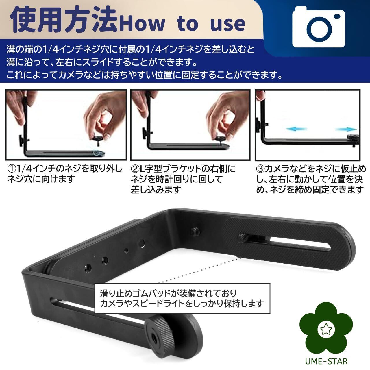 溝の端の1/4インチネジ穴に付属の1/4インチネジを差し込むと溝に沿って、左右にスライドすることができます。これによってカメラなどは持ちやすい位置に固定することができます。 また、滑り止めゴムパッドが装備されており、カメラやスピードライトをしっかり保持します。