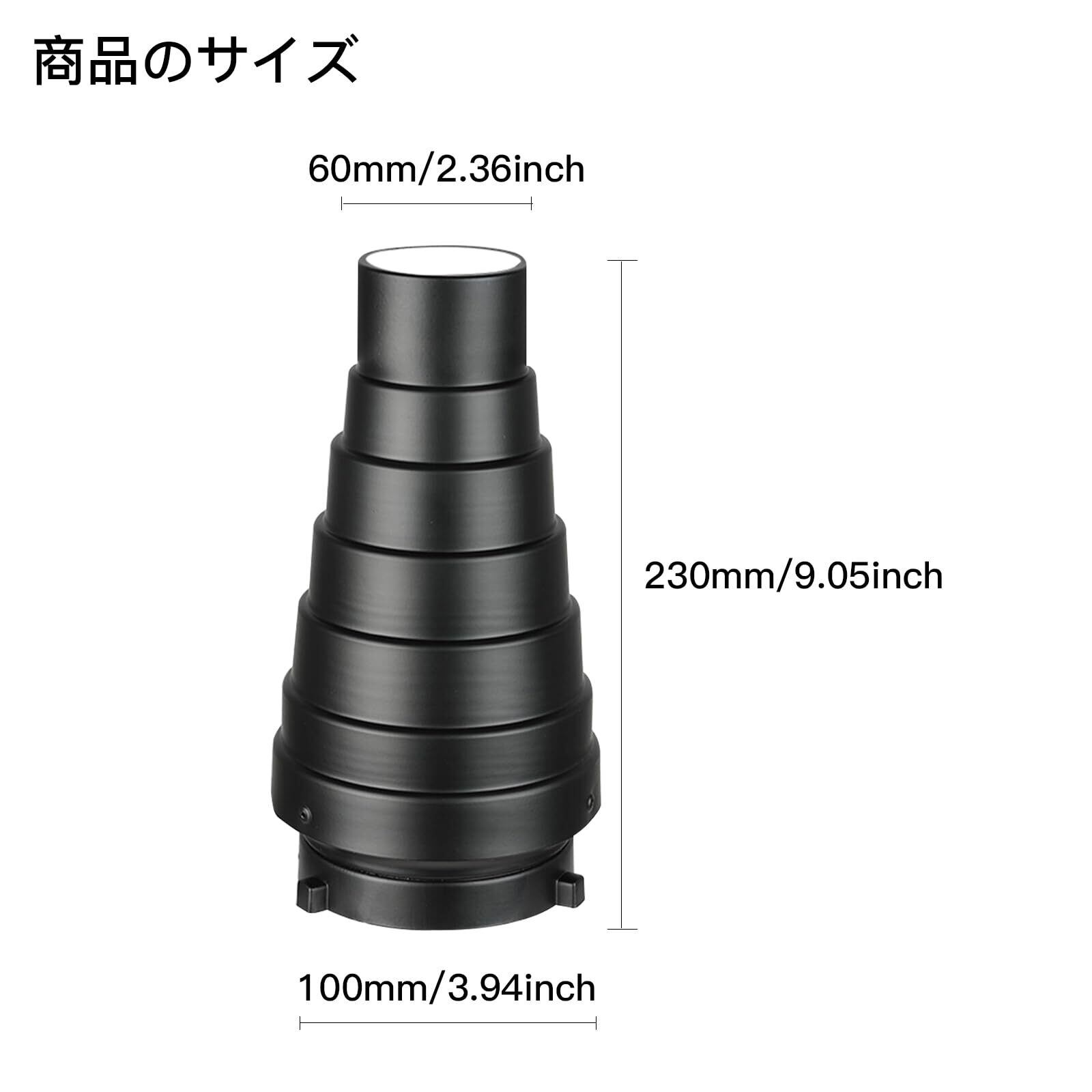 【実用性】:円錐形のスヌートはオブジェクトの形状と輪郭をよりよく捉えます。円錐形は光線の範囲を制限するために使用されます。プロのスタジオには1つが必要です。