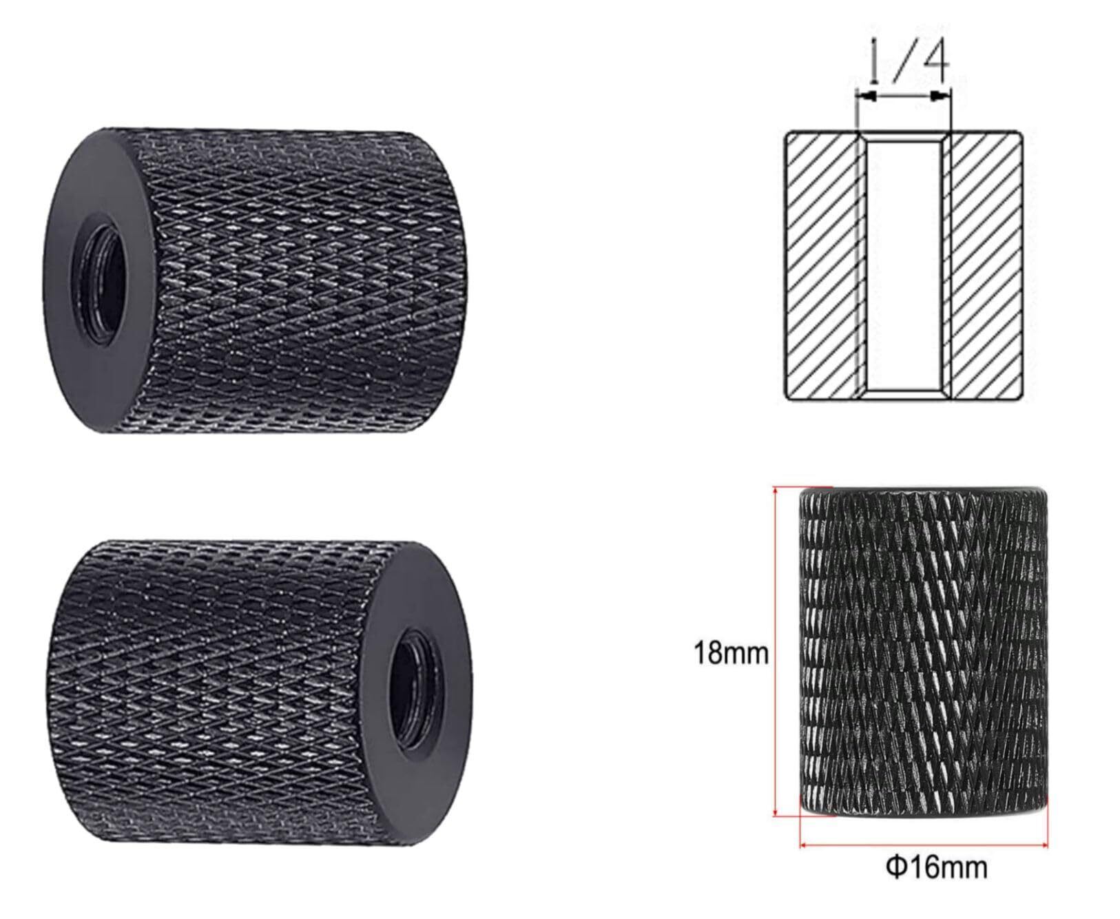 【製品概要】ネジ径: 1/4"-20(メスーメス)、 サイズ:全長18mm; 直径φ16㎜ 材質:アルミ合金製 重量:8.5g/個 カラー:ベーシック ブラック(黒・無地) セット内容:1/4メスから1/4メス 変換アダプター x4個