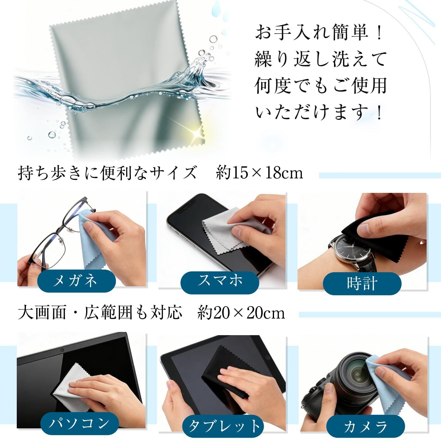 【用途に合わせて選べる実用サイズ設計】20×20cmの大判サイズは眼鏡・スマホ・タブレット・モニターなど広い面積の清掃に最適。15×18cmサイズはカメラレンズや時計など細かい部分の拭き取りに便利で、用途に応じた使い分けが可能です。