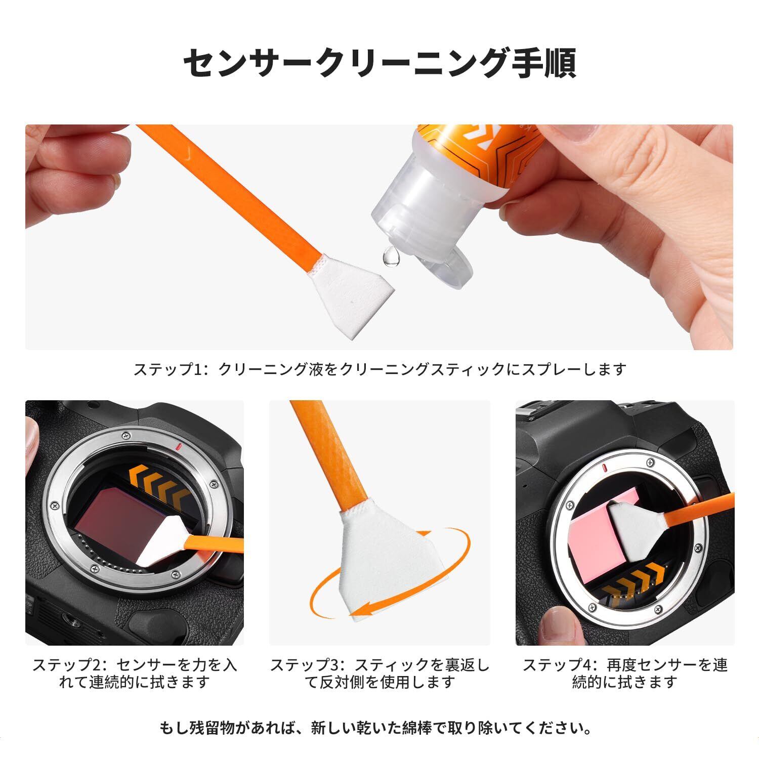 【2本洗浄液入り】60mlの純水クリーニング液は、高純度の純水成分を含み、純粋で不純物がありません。電子製品の表面の静電気を低減し、ほこりなどの不純物の付着を減少させます。この洗浄液はカメラレンズやデジタルスクリーンに対応。20mlクリーニング液はカメラセンサーに適用、クリーニングスティックに1滴垂らしてから使用してください。
