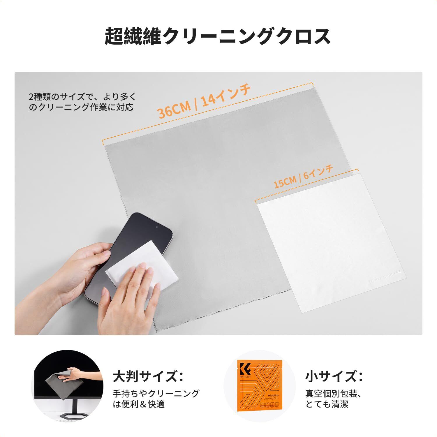 【2サイズマイクロクロス】15cm×15cmのクリーニングクロスはカメラのディスプレイやファインダーの清掃に使用できます。36cm×36cmの大判クリーニングクロスはカメラ本体やレンズなどの清掃に適しています。素材は超細繊維で、柔らかく伸縮性があり、吸水性に優れており、機器上のほこりや汚れを素早く取り除くことができます。