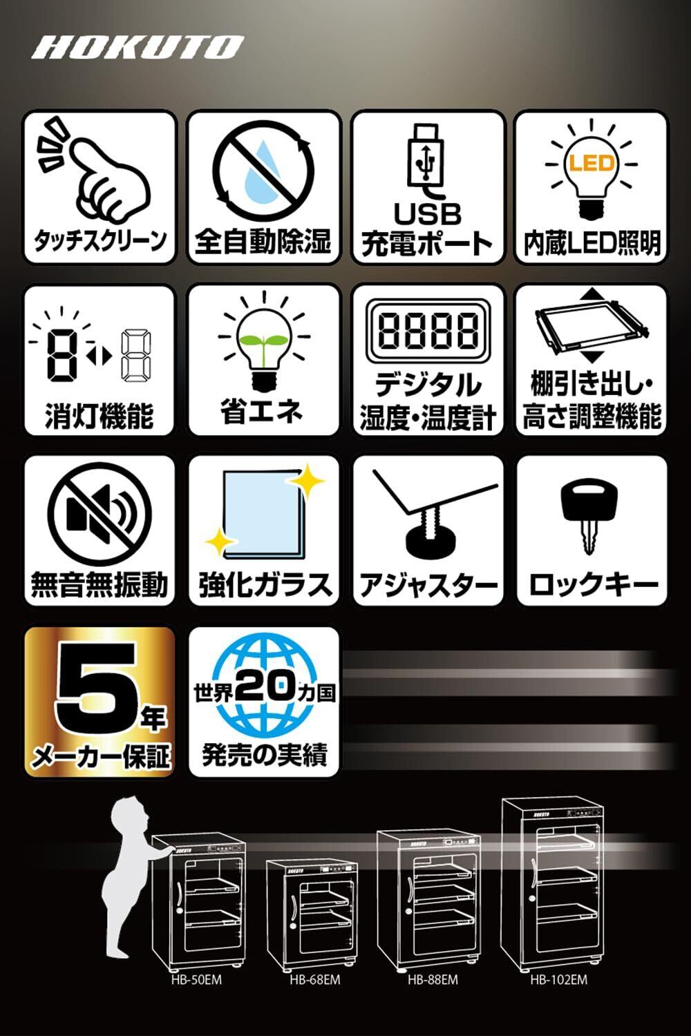HOKUTO 防湿庫・ドライボックス HB-102EM HBシリーズ タッチパネル、オートドライ&省エネ機能搭載 デジタル湿度表示 LEDライト内蔵 湿度管理楽々 (100Lタッチスクリーン)