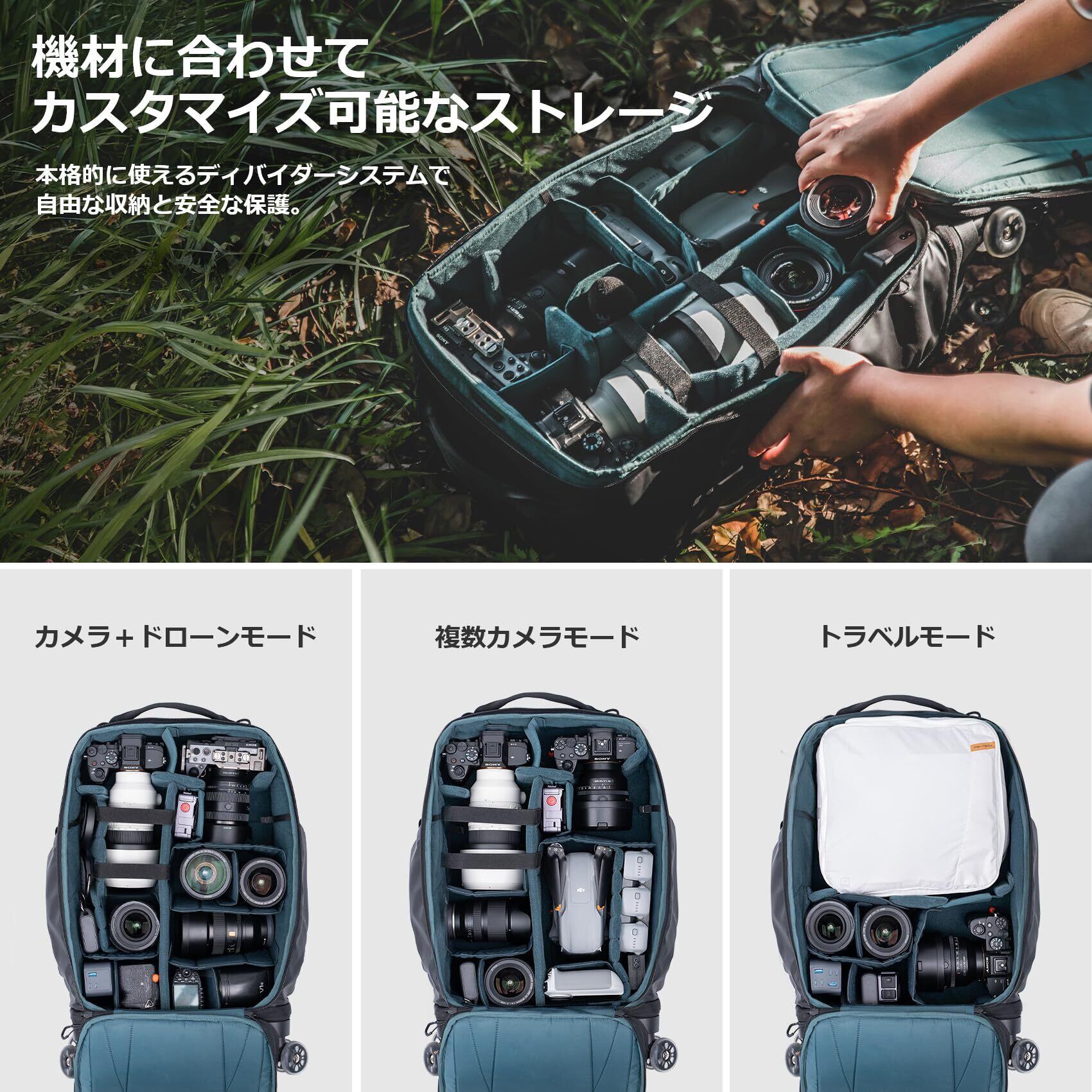 2Wayモード:トロリーモードとバックパックモード - 360°回転ホイールとアルミ合金ワイドハンドルで重いカメラ機材を楽に持ち運べるトロリーモード、隠しバックパネルとストラップ設計でクイックリリースホイールシステムにより、様々なシーンに柔軟対応するバックパックモード。 カスタマイズ可能な仕切りシステムと大容量メインコンパートメント - 柔軟な収納と安全保護を提供し、30Lの大容量で最大2台のデジタル一眼レフまたはミラーレスカメラ、9本のレンズ、200-600mmレンズ、またはDJIドローンなどを収納可能。 高性能静音360°回転ホイールと三段式アルミハンドル - PU注入によりで耐久性が高く、クイックリリースホイールシステムで航空基準を満たしつつ一般機内持ち込みより最大8%広いスペースを実現。バランスの取れた省力ハンドリングで空間利用率を最適化。 10L拡張フロントコンパートメントと豊富な収納スペース - ジンバルや衣類を収納可能。16インチノートPCやiPad対応、多様なポケット、水筒ポケットで三脚収納も。YKKジッパーで安全耐久性。 高性能PU防滴生地と軽量設計 - 耐傷・耐摩耗・耐汚れ。一体成型ベースで安定バランス、軽量構造で同クラス最軽量。標準アクセサリーとしてデジタル収納バッグ、固定バンド、防雨カバー、隠しAirTagポケット付きで便利で防盗。