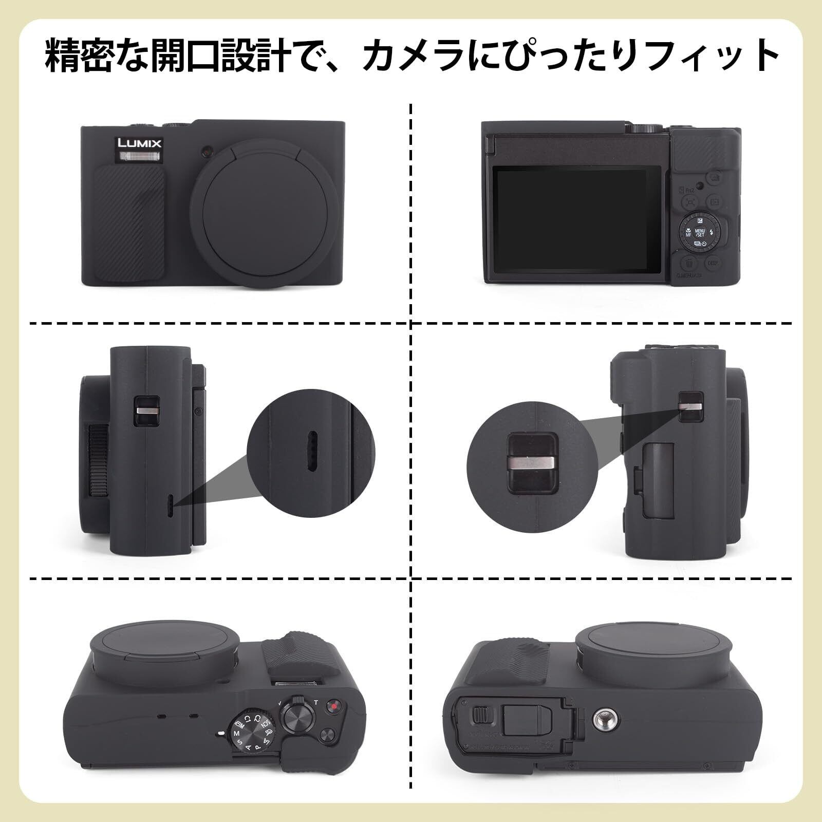 【正確なカットアウト】DC-TZ99/ZS99シリコンケースは正確なカットアウトが施されており、底部の開口部によりバッテリー/メモリカードスロットにアクセスでき、バッテリーやSDカードを直接交換でき、画面を自由に反転させることができ、充電ポートに直接アクセスできます。 底面の正確な穴は三脚マウントと互換性があり、ケースを取り外すことなく正常に撮影できます。