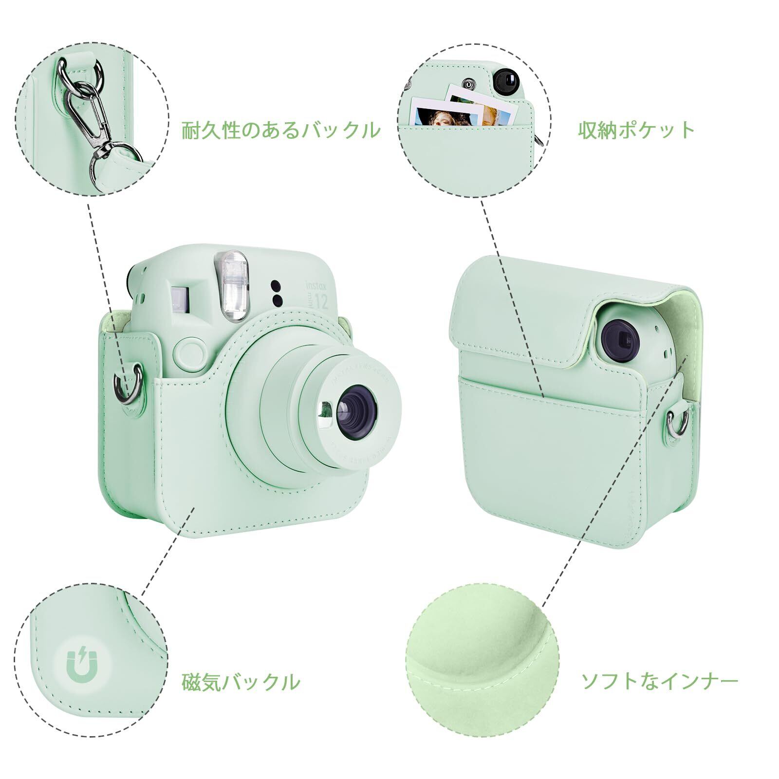 Rieibi instax mini 12ケース、Fuji チェキ instax mini 12 収納バッグ PUレザー マグネットで開け ショルダーストラップ付 携帯便利 軽量 全面保護 おしゃれ(GR)