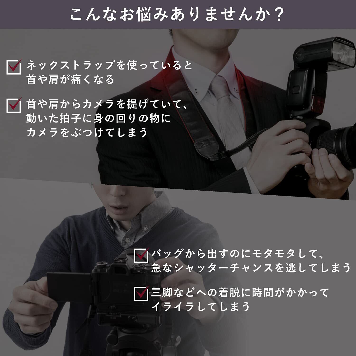 【負担軽減】長時間の利用でも肩が凝りません。ネックストラップより疲れにくく快適です。 固定されカメラが安定するので、ブラブラすることがなく すぐに動けて機動力が高まります。 動き回っても大切なカメラを落としません。