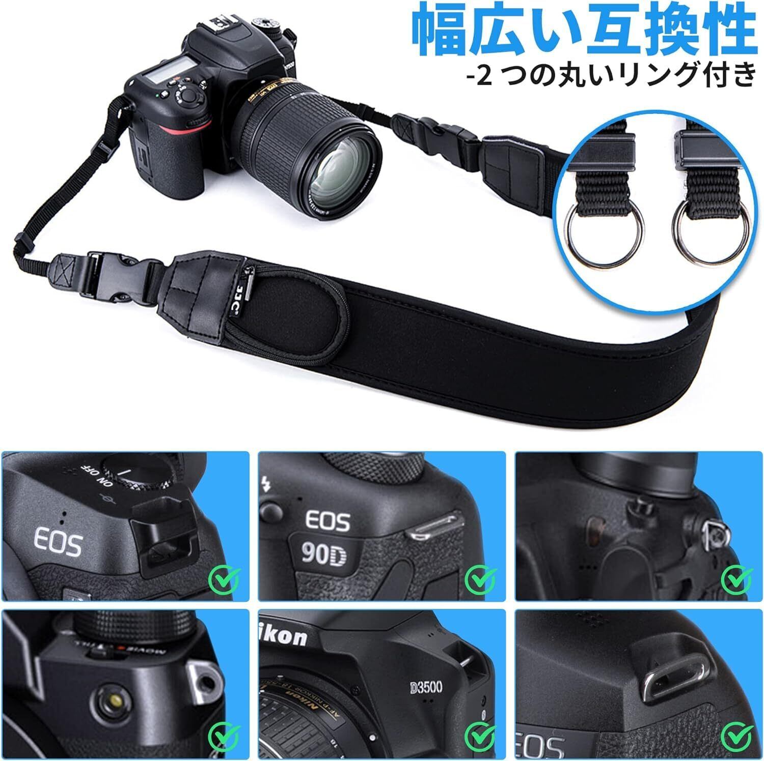 【高品質材質採用&快適性を上げる】高品質のネオプレン素材で作られてカメラストラップで、伸縮性、クッション性があり首や肩への負担が少なくて、頑丈で耐久性があり、耐摩耗性もあります。超柔軟超ソフトで快適性を上げます。側面は滑り止め設計で、撮影時にベルトが絡まないようになっています。このようにして、撮影時の安定性を高めることができます。