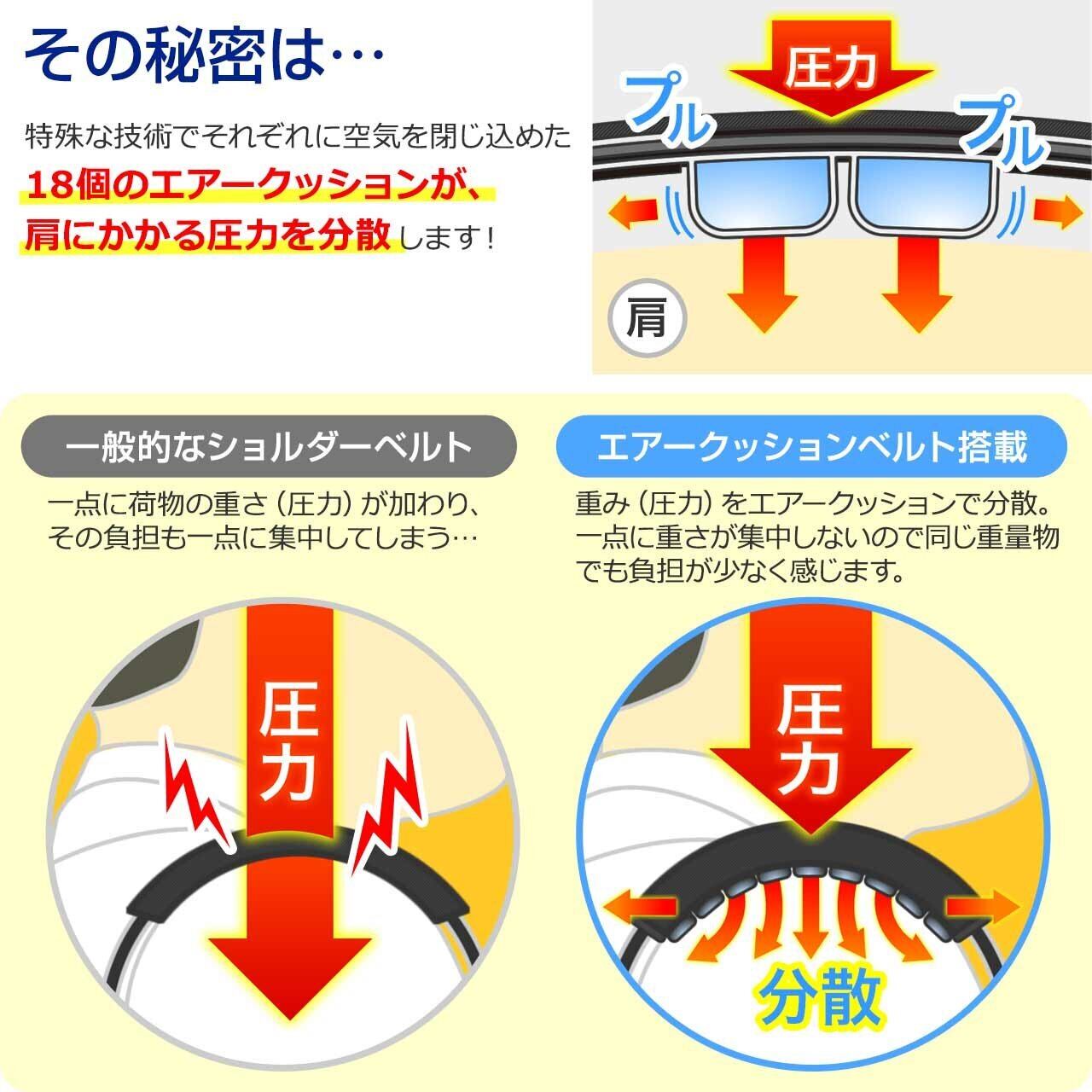 一般的なショルダーベルトと比べ、柔らかくクッション性を備えています。セルは完全に独立しているので仮に一つの空気が抜けても他のセルがカバーします。