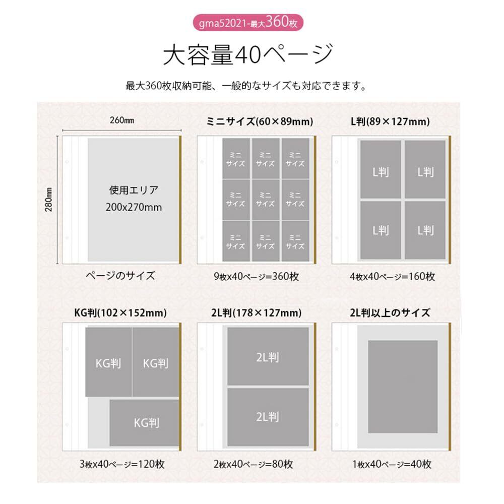 【360枚大容量アルバム】ミニサイズ 360枚 、L判 160枚、KG判 120枚、 2L判 80枚 本体重量:0.98kg タテ280×ヨコ260×背幅30mm 40ページ 最大480枚収納収納可能、一般的なサイズも対応できます。布地表紙 BOPP Film(ポリプロピレン) 粘着タイプ白い台紙