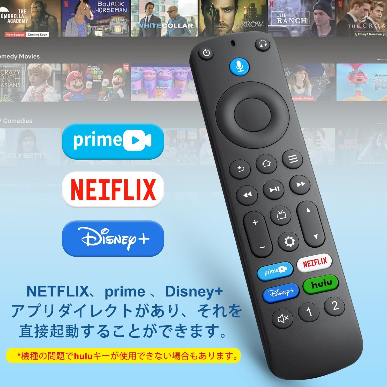 【対応機種】For Stick TV (第2世代/第3世代/Lite/4K)、TV Cube (第1世代/第2世代/第3世代) 、Echo Show 15、All 東芝 ファイヤースティックTVsに適します。※ふぁいやースティックtv リモコンの電源:単4形乾電池×2本使用(別売)。機種の問題でhuluキーが使用できない場合もあります。