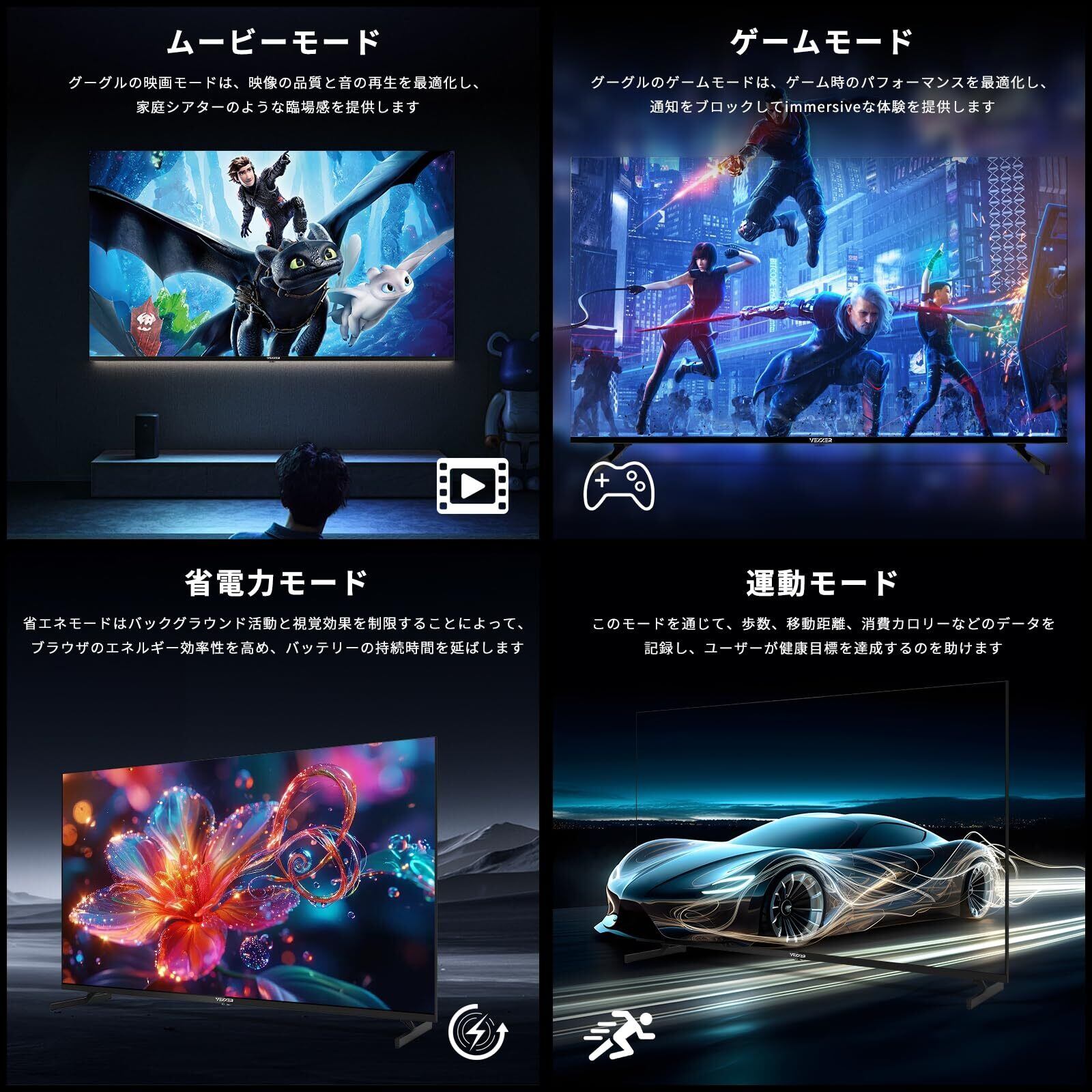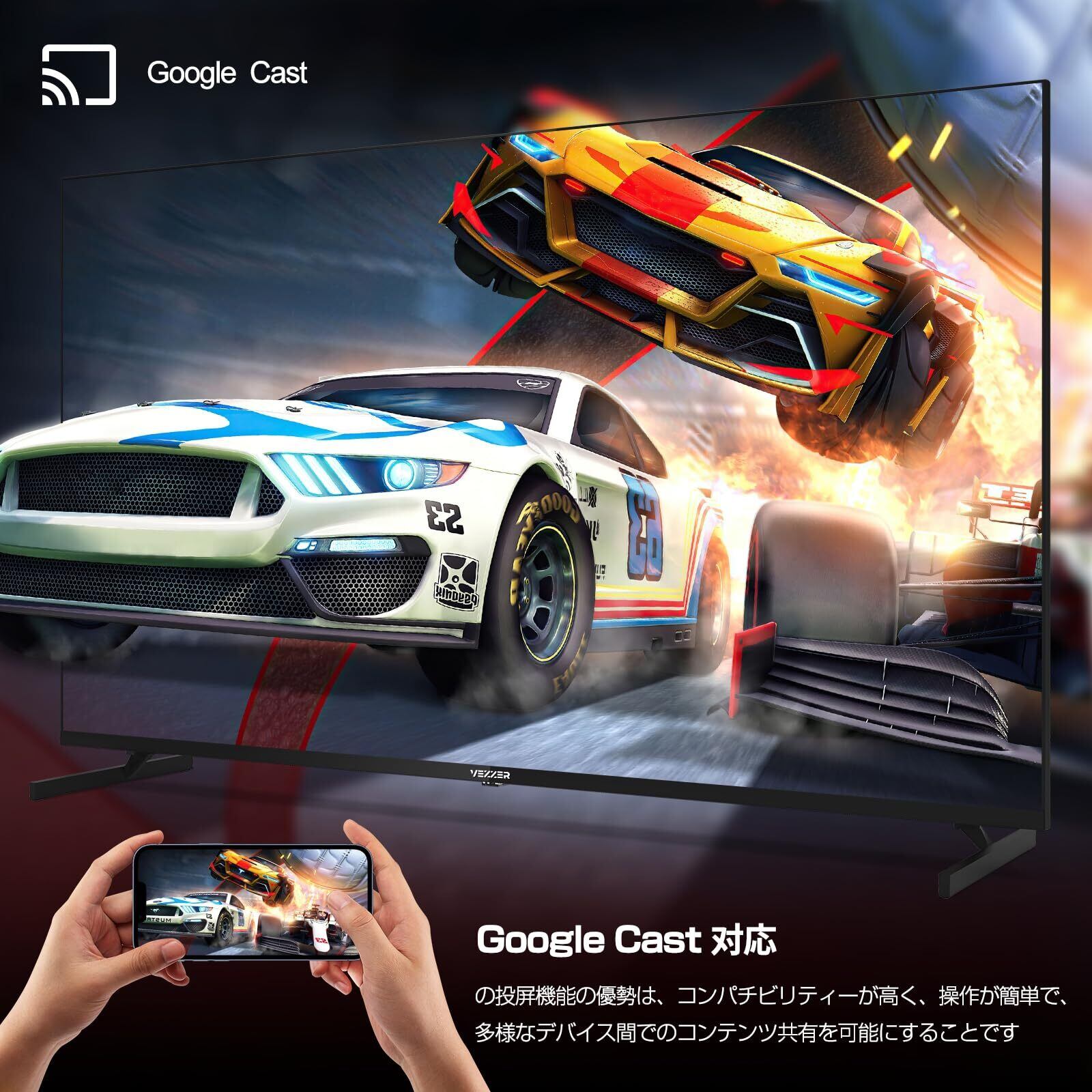 【クロームキャスト機能内蔵】 ネット動画を大画面で見たい方へ 「Chromecast(機能)」が搭載(built-in)されているため、スマホやタブレットを連携させることで今まで小さい画面で見ていた動画やゲームを大画面で楽しめます。プライベートコンテンツの表示やワーキングディスプレイとしての活用も可能です。