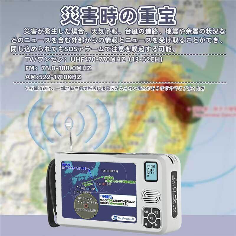 【2026年新モデルワンセグテレビ】 ●5インチ高精細液晶パネルを搭載したワンセグテレビ。災害時でも見やすく、確実な情報収集をサポートします。 ●ワンセグ(UHF 470~770MHz/13~62ch)に対応。地上デジタル音声放送対応のデジタルチューナーを内蔵。 ●FM/AMラジオ搭載:FM 76.0~108.0MHz、AM 522~1710kHz。ボタン一つで簡単に切り替え可能。 ●SW短波機能付き:付属の5mアンテナでラジオNIKKEIなど全球受信に対応。 ●生活防災インテリジェンス設計。キッチンでの家事中から工事現場までマルチユース。停電時でも最大72時間動作(手動発電機兼用)。JIS規格適合の防塵防水設計(IPX4)。