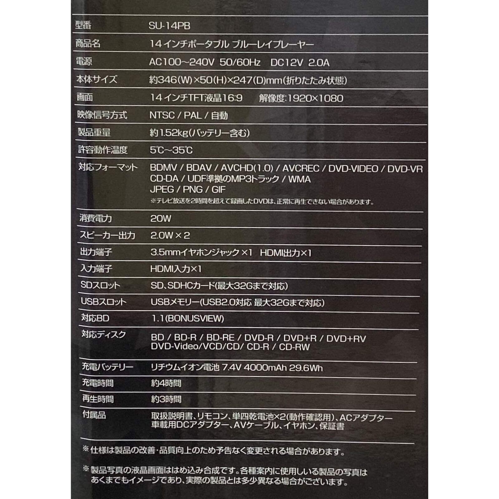 【整備済み品】 アグレクション 14インチ ポータブルブルーレイディスクプレーヤー SU-14PB 充電バッテリー搭載 (整備済み品)