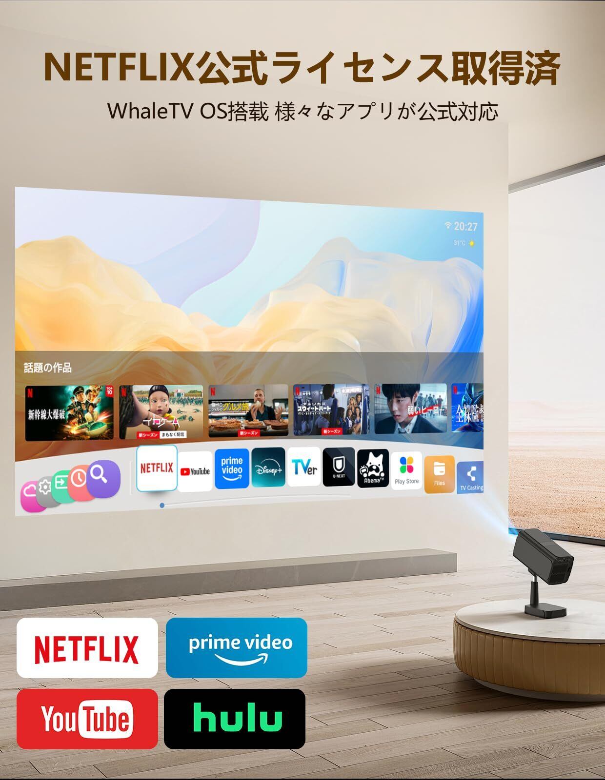 【Netflix正式認定による最適化された視聴体験】 このNetflix公式認定プロジェクターは「Whale TV OS」を搭載しNetflix、YouTube、Prime Videoなどの主要動画アプリへ直接アクセスすることが可能であります。このホームシアタープロジェクターは市販のAndroid OSではなく、Netflix正式認定の「Whale TV OS」を搭載しており、システムの動作が極めて安定しております。視聴中の予期せぬフリーズやアプリの強制終了を防止し、没入できる高品質なエンターテインメントを提供いたします。本物の証明であるパッケージのNetflixロゴが、その公式な品質をいたします。