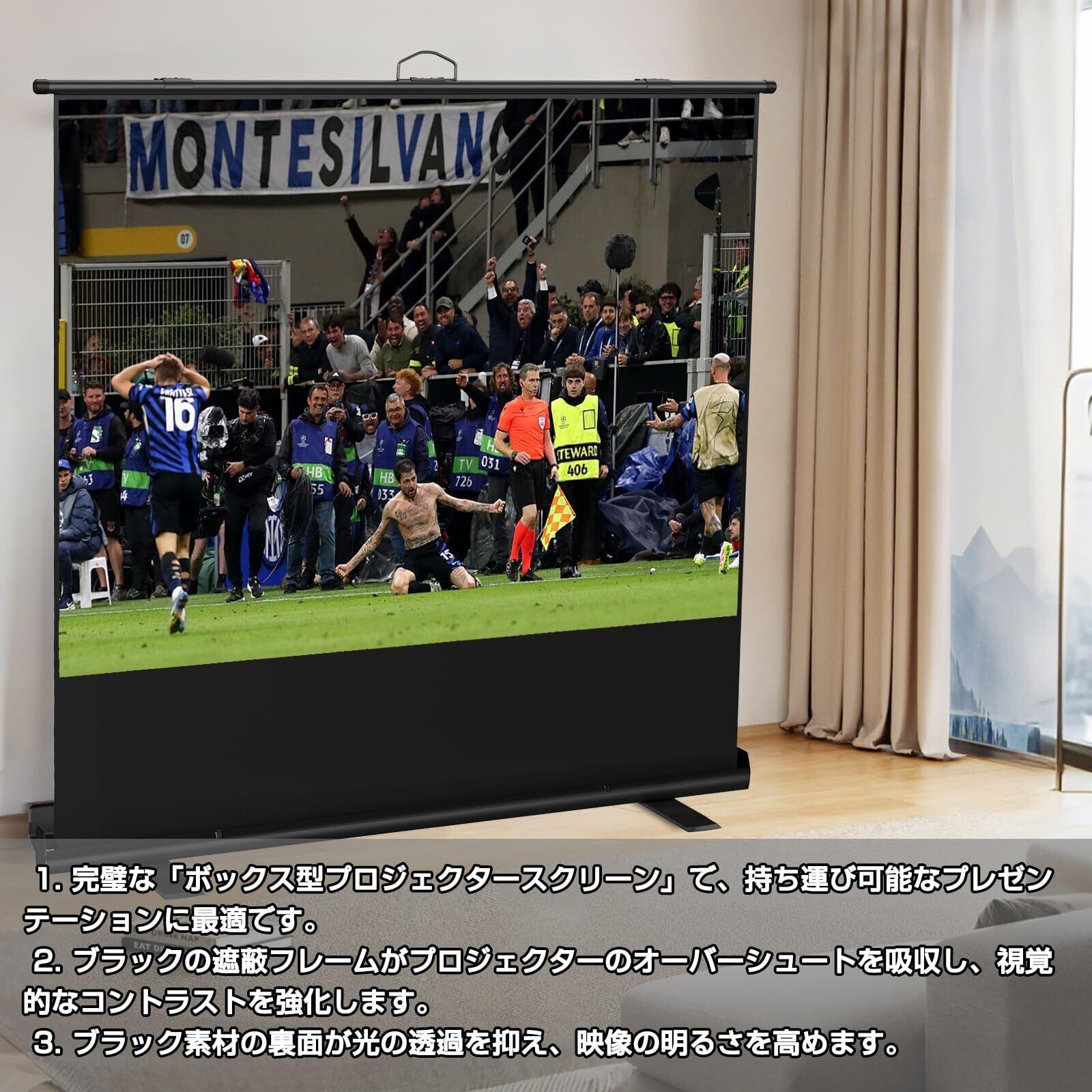 【4:3の比率と180°の広視野角】:4:3の映像は、ストリーミングTVや映画の視聴、オフィス、ビジネス、または教室の資料の投影、教会やの講座、会議、コンサート、スポーツ会場などでよく使われる画面比率です。高い1.2のスクリーンゲインので、非常に画質のよい、ほかのスクリーンよりももっとはっきり明るい良いな視覚の体験を楽しむことができます。視野角180°のプロジェクションスクリーンは、家族や友人と一緒に映画を見るのに最適です。