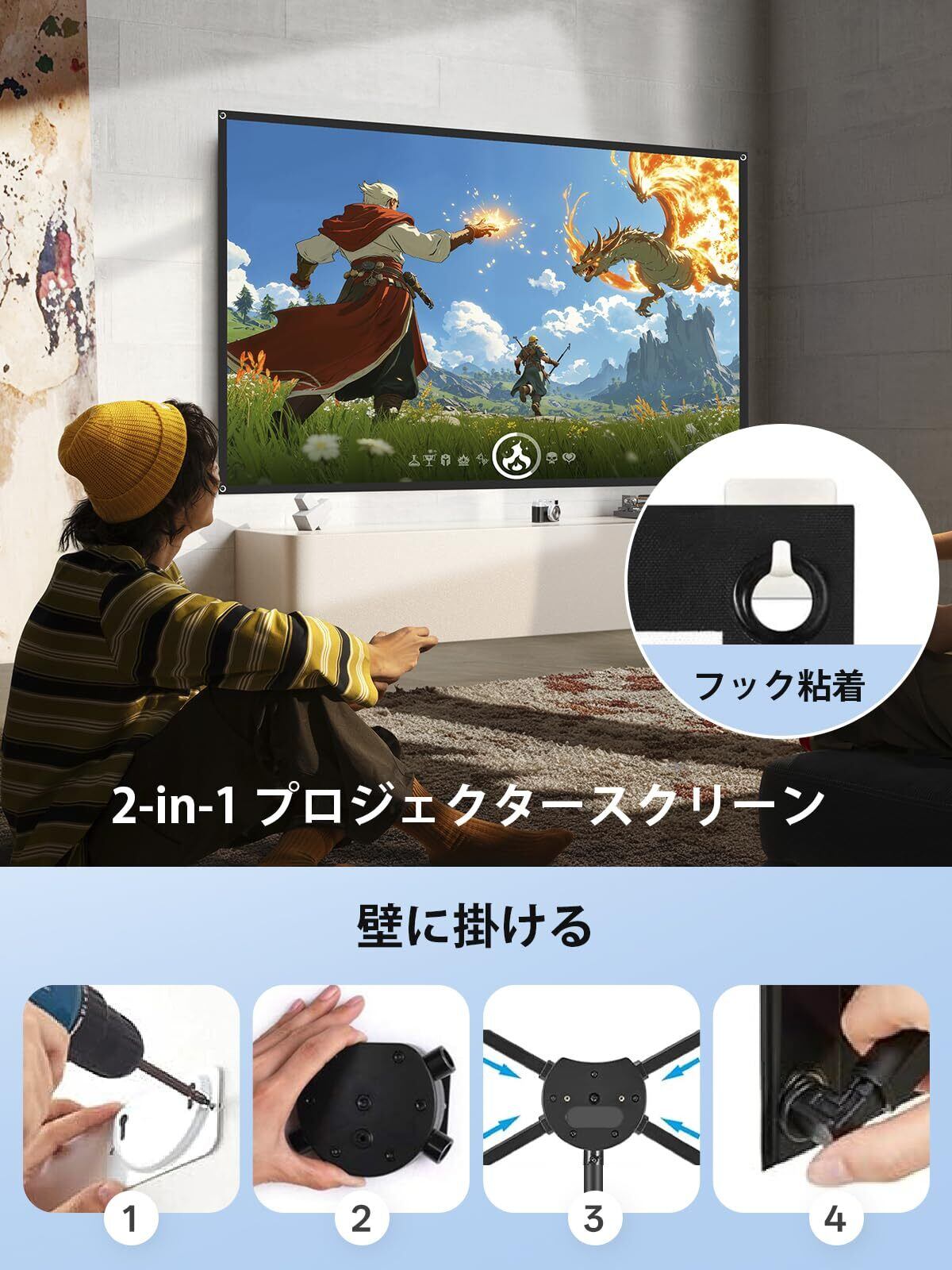 プレミアムガラス繊維材料:当社のスクリーンは、グラスファイバー製の基布を表裏のPVCで挟んだ構造になっています。高精細なグラスファイバー製の生地を使用し、表面には特殊なコーティングが施されています。このスクリーンは、投影された映像の鮮明さを完全に復元し、解像度とコントラストを向上させます。しわが付きにくくお手入れが簡単なPVC素材のプロジェクタースクリーンです。黄ばみや色あせを抑え、お気に入りの映画をいつでも美しく楽しめます。