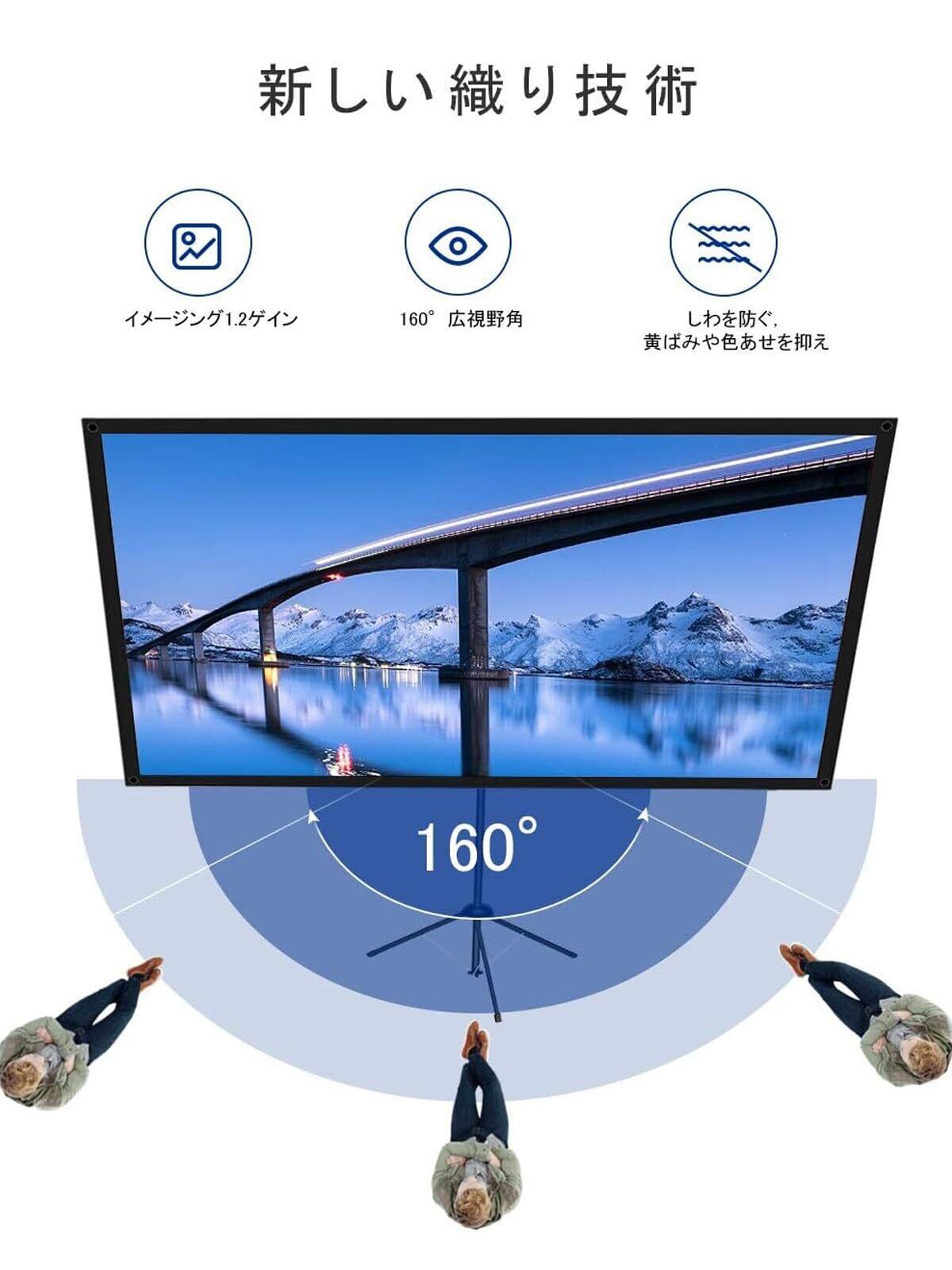 16:9の比率と160°の広視野角:16:9の映像は、デジタルテレビ、ミュージックビデオ、映画、アニメ/TVシリーズ/DVDビデオ、Youtubeビデオなどでよく使われる画面比率です。高い1.2のスクリーンゲインので、非常に画質のよい、ほかのスクリーンよりももっとはっきり明るい良いな視覚の体験を楽しむことができます。視野角160°のプロジェクションスクリーンは、家族や友人と一緒に映画を見るのに最適です。
