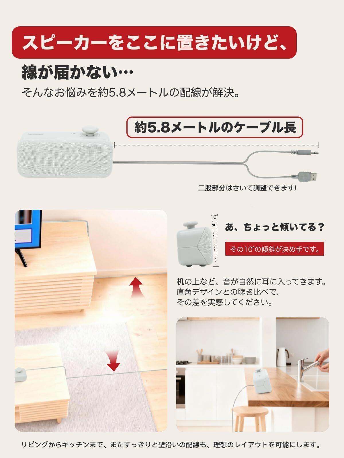 【6W出力×約5.8mの「思いやり」ケーブル】「テレビの音声をキッチンでも聞きたい」「コードをごちゃつかせたくない」。そんな欲張りな要望に応える設計です。競合より力強い6W出力で音をロスなく届け、約5.8mのロングコードが、コンセントの制約と見た目の煩わしさを解消。機能と美観の新基準です。
