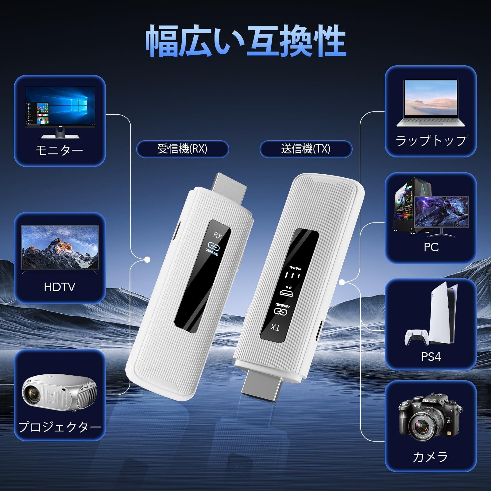 【接続状態を簡単に確認できるディスプレイ】HDMI無線送信器と受信器には、内蔵LEDディスプレイで、接続状態、信号状態、出力状態、電源状態がより直感的で容易に確認できるようになりました。プレゼンテーションやビデオ投影中の接続の安定性を確認するのに最適です。このワイヤレスHDMIトランスミッターで、簡単に接続を管理し、スムーズな体験を自信を持ってお楽しみください。