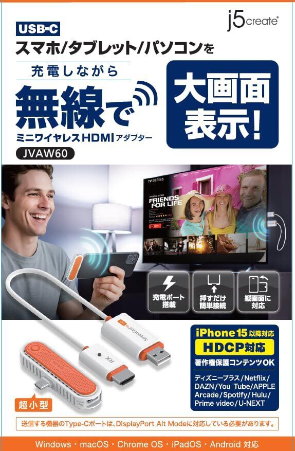 【2022最新】j5create【2025年12月新登場 世界最小クラス】 j5create ワイヤレスHDMI 無線送受信機セット DP Alt Mode対応 HDCP対応 USB-C充電対応 技適認証済み 超低遅延 受信機単体使用可 フルHD ミラーリング対応 最新iPhone17 シリーズ スマホ タブレット PC対応 無線伝送30m ネットワーク不要 縦横表示 ワンボタン切替 JVAW60-EJ