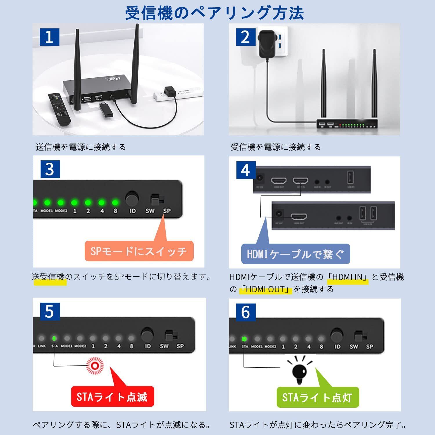 受信機増設ペアリングについて:1.送信機TX、増設の受信機RXの電源を入れたら、RXとTXの「SW/SPスイッチ」をSPモードに切り替えます。2.HDMIケーブルで送信機TXの「HDMI IN」と受信機RXの「HDMI OUT」を接続し、ペアリングが自動的に開始します。3.ペアリングできたら、TXとRXのSTAライトがしばらく点滅してから、点灯します。STAライトが常に点灯している場合、送受信機のペアリングが完了しています。 4.ペアリング後、次回からは自動で接続されます。