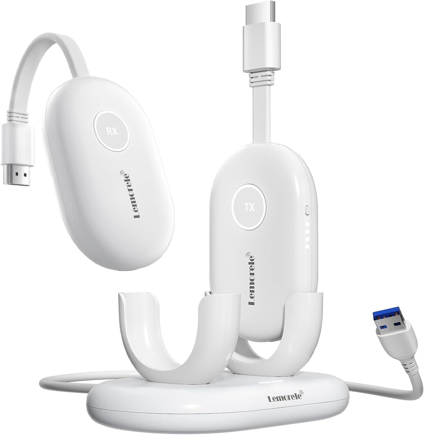 【2025年新登場 磁気 収納ボックスと電源充電発売 機能抜群】: Lemorele G500 磁気 収納ボックスにはHDMI トランスミッターを収納するためのコンパートメントが 2 つあります。 HDMI トランスミッターを充電コンパートメントに戻すと、充電を開始でき、順方向および逆方向の挿入をサポートします。インテリジェントチップ制御により、過電流、過電圧、過負荷保護を実現し、フル充電後に自動的に停止します(送信機が充電コンパートメント内で完全に充電されると、4つのインジケータライトが同時に点灯し、使用準備ができたときに電力レベルを確認できます)。