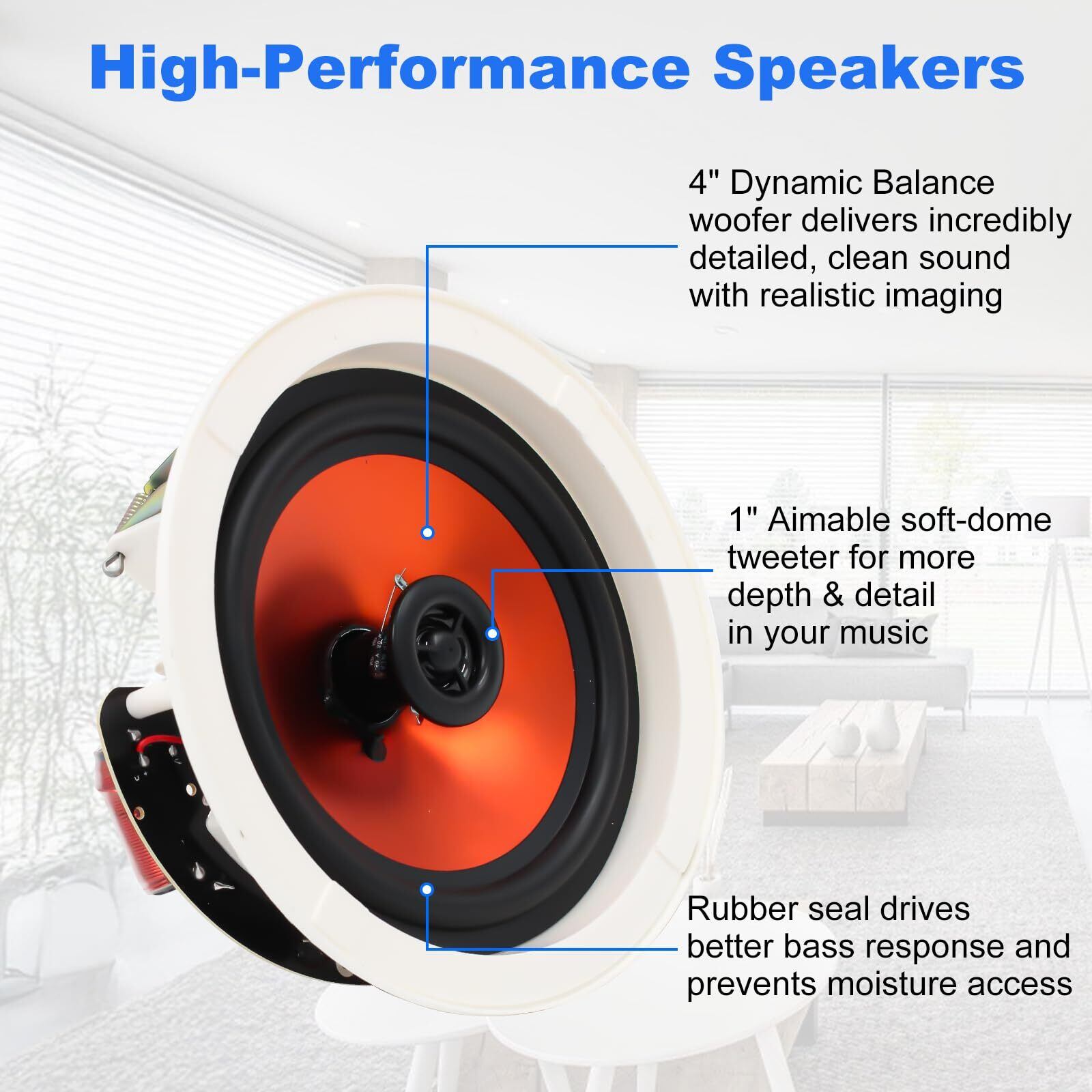 【優れた音質】: 4インチのフルレンジスピーカーを搭載したこのシーリングスピーカーは、印象的なオーディオパフォーマンスを提供します。 50Hz~20KHzの周波数範囲をカバーし、クリアな高音、豊かな中域、深低域をします。 RMS 30W電力(最大120W)と89dBの感度により、大音量でクリアなサウンドを提供し、1%以下の歪み率で大音量でも純粋なオーディオをし、臨場感のあるリスニング体験を提供します。
