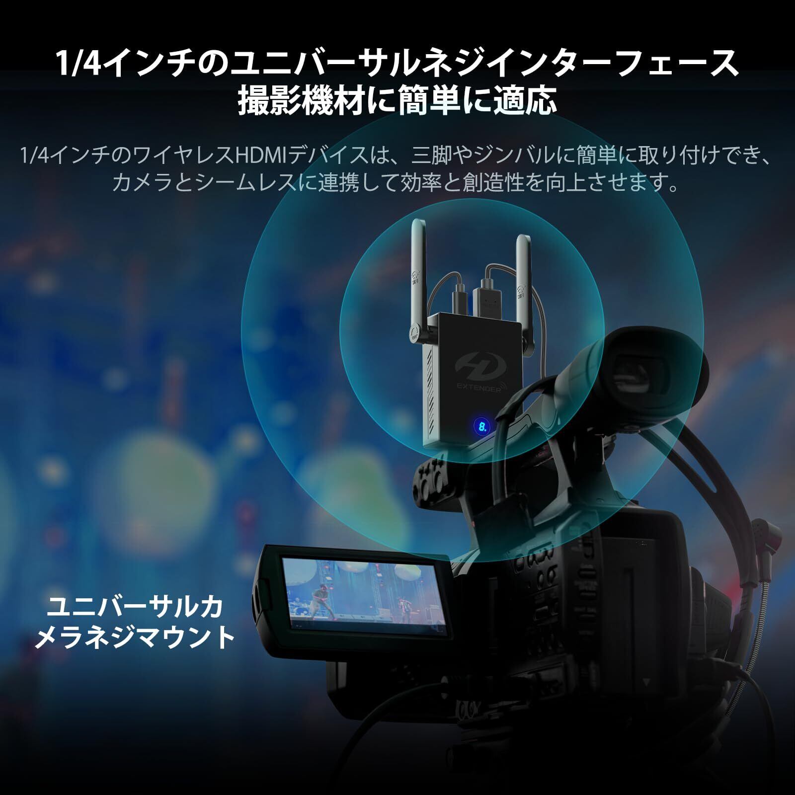1/4 インチ スレッド インターフェイス: 1/4 インチ スレッドのワイヤレス HDMI デバイスは、三脚やジンバルに簡単に取り付けられ、カメラとシームレスに統合されます。ケーブルの制約がなくなり、ダイナミックな屋外ライブ ストリーミングや映画制作の多彩なアングルに柔軟性を提供し、撮影効率を高めて創造性を解き放ちます。