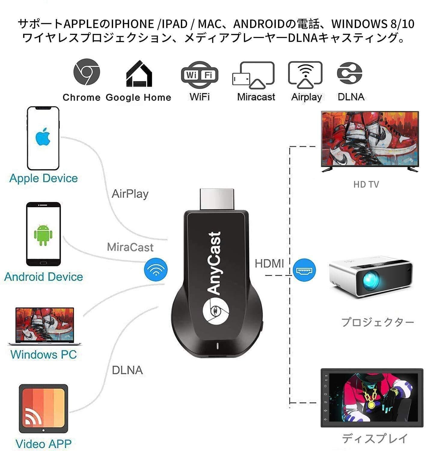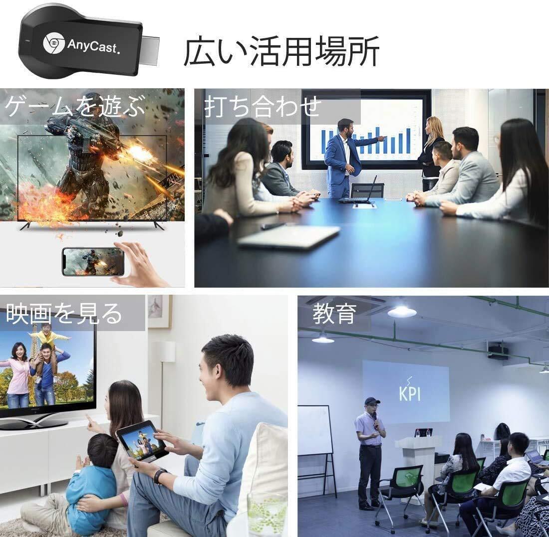 Anycast クロームキャスト ミラーキャスト1080P 無線HDMI レスモード切替え不要の簡単接続 大画面/動画転送 HDMIミラーキャストスマホテレビ接続 iOS&Android&Windows&MAC OS対応 Miracast/AirPlay/Chrome アプリ互換性あり4