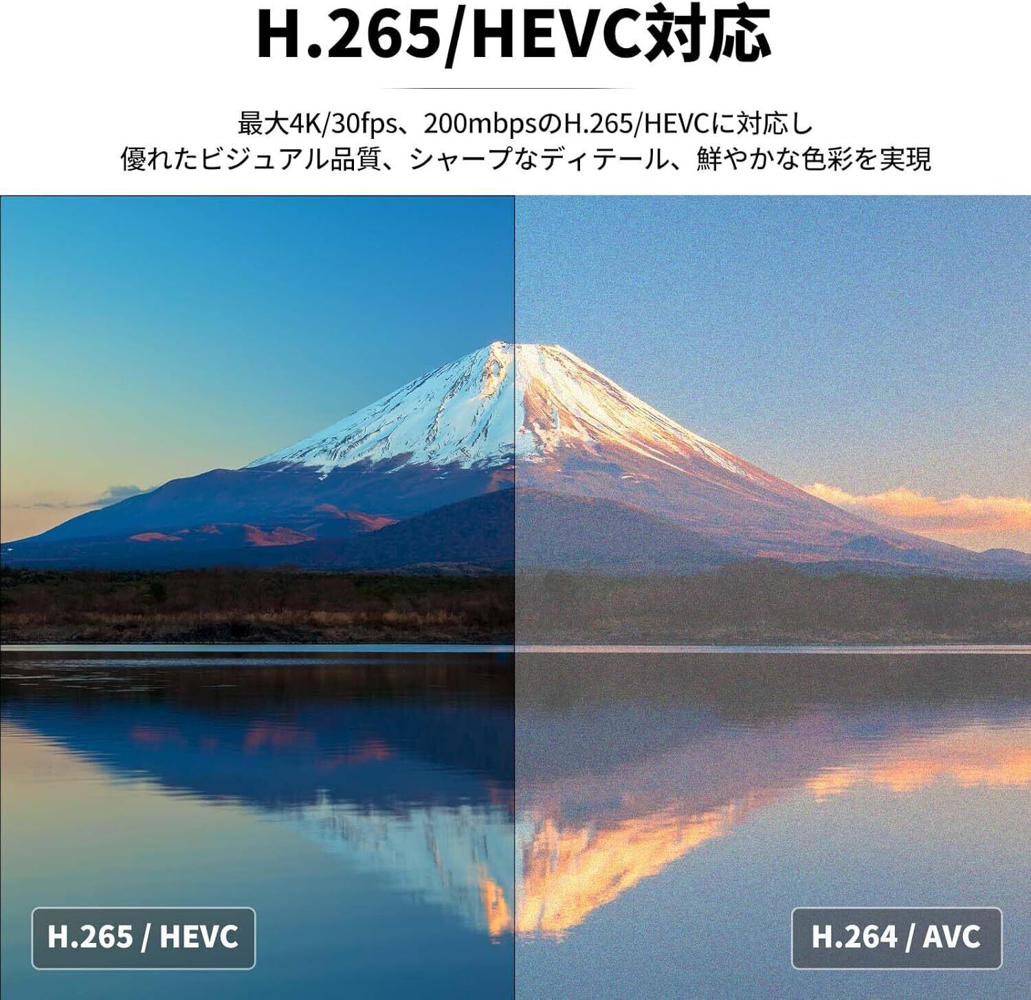 【対応メディアフォーマット】- ビデオはH.265/HEVC、H.264/AVC、VC1、または MPEG2/4 コーデックの MP4、MKV、AVI、TS/TP、MOV、VOB、M2TS ファイルを使っており、最大 4096x2160p@30fps、10 ビット カラー、250mbps の解像度に達します。写真 JPG、JPEG、BMP、GIF (アニメーションなし)、PNGに対応し、音楽 MP3、WMA、OGG、FLAC、APE、AACに対応いたします。