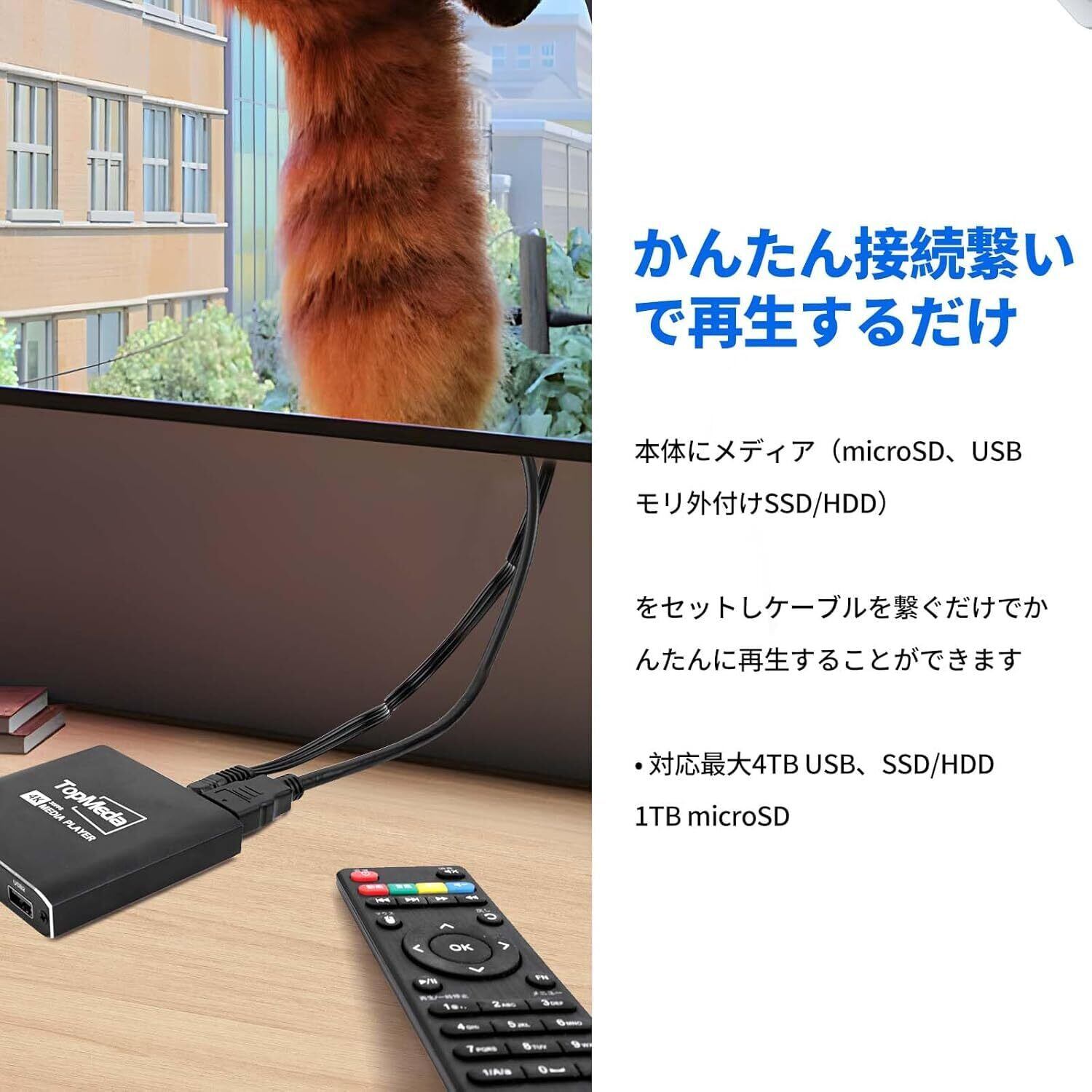 【お使いテレビがもっとスマート】- USB ドライブまたは MicroSD カードを利用してビデオ、音楽、写真のスライドショーを再生することによって、Topmeda 4K メディア プレーヤーはすべてのテレビをもっとスマートになります!本製品は小型で、安くて、シンプルで直感的、面倒な操作がなく、誰でも簡単に使えます!
