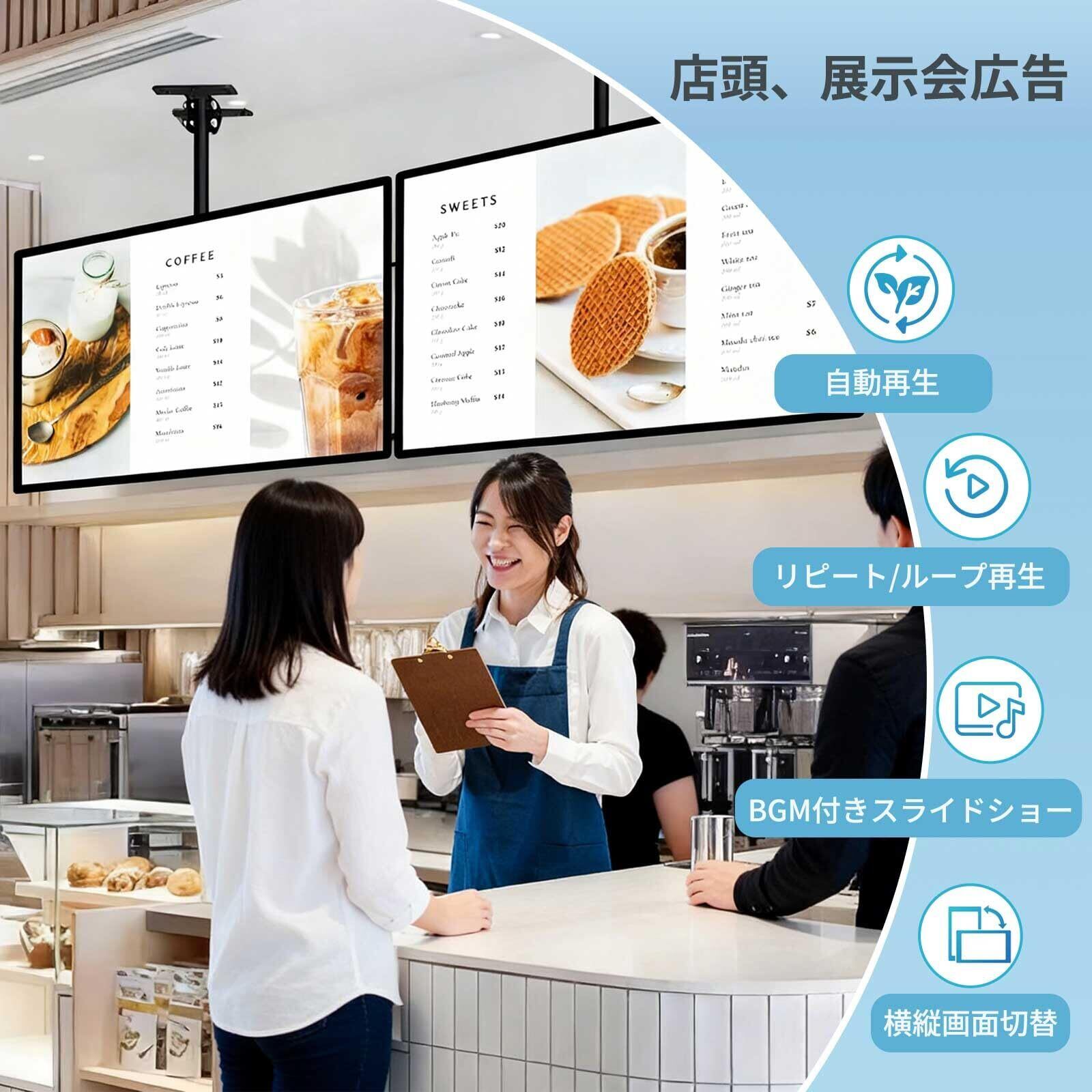 【デジタルサイネージ利用にも最適】店舗の新品やお勧め商品の広告または 動画 を入れた SDカード 、 USBメモリー を本体に挿すだけで自動的にコンテンツ再生 。「リピート再生」「自動再生」「BGM」「再開機能」対応していますので、液晶ディスプレイにHDMIまたはRCAケーブルでつなぐだけで、デジタルサイネージ用途にもご活用いただけます。家にお子様の可愛い写真を展覧できます。