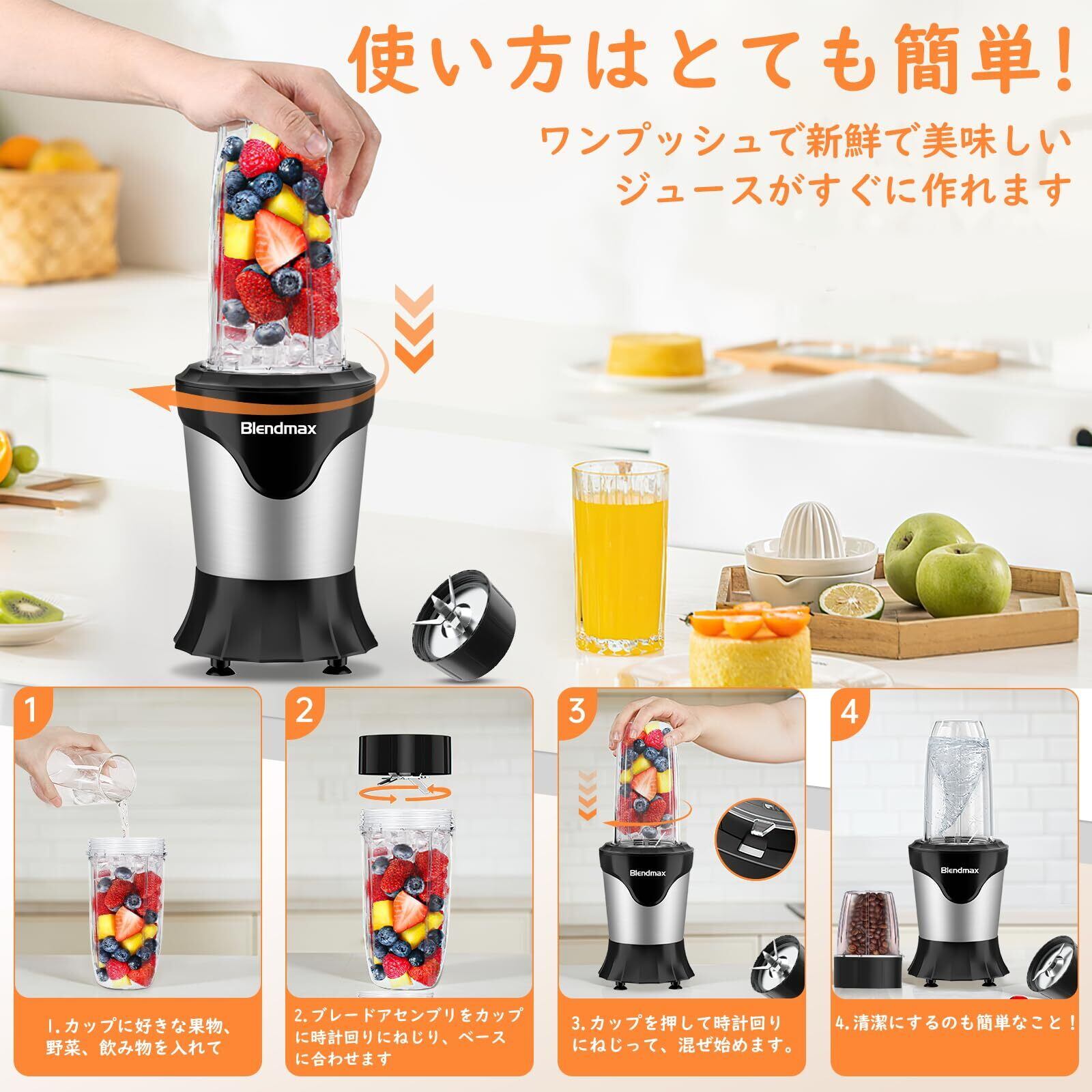 【食品グレード素材&安全設計&パッケージ内容】BPAフリーで無毒・無害な安全素材を使用したミキサーです。モーターは純銅製で、優れた耐久性を誇ります。また、高品質のABS素材を採用しており、耐寒・耐熱性能も抜群です。温度保護機能や誤作動防止の安全装置も搭載しており、安心してご利用いただけます。【フルセットのパッケージ内容】:モーターベース*1、600mLのジュースカップ*1、300mLのミルカップ*1、飲み口カップ*1、6枚刃カッター*1、2枚刃カッター*1、蓋*1、调味料用盖(穴付き)*1、ブラシ*1と日本語マニュアル、合わせて10点のセット付きますキッチン、アウトドア、旅行、出張、ジム、オフィスなど、さまざまな場所で簡単に使用できます。友達や家族へのプレゼント、誕生日、クリスマスギフトなどにも最適です。
