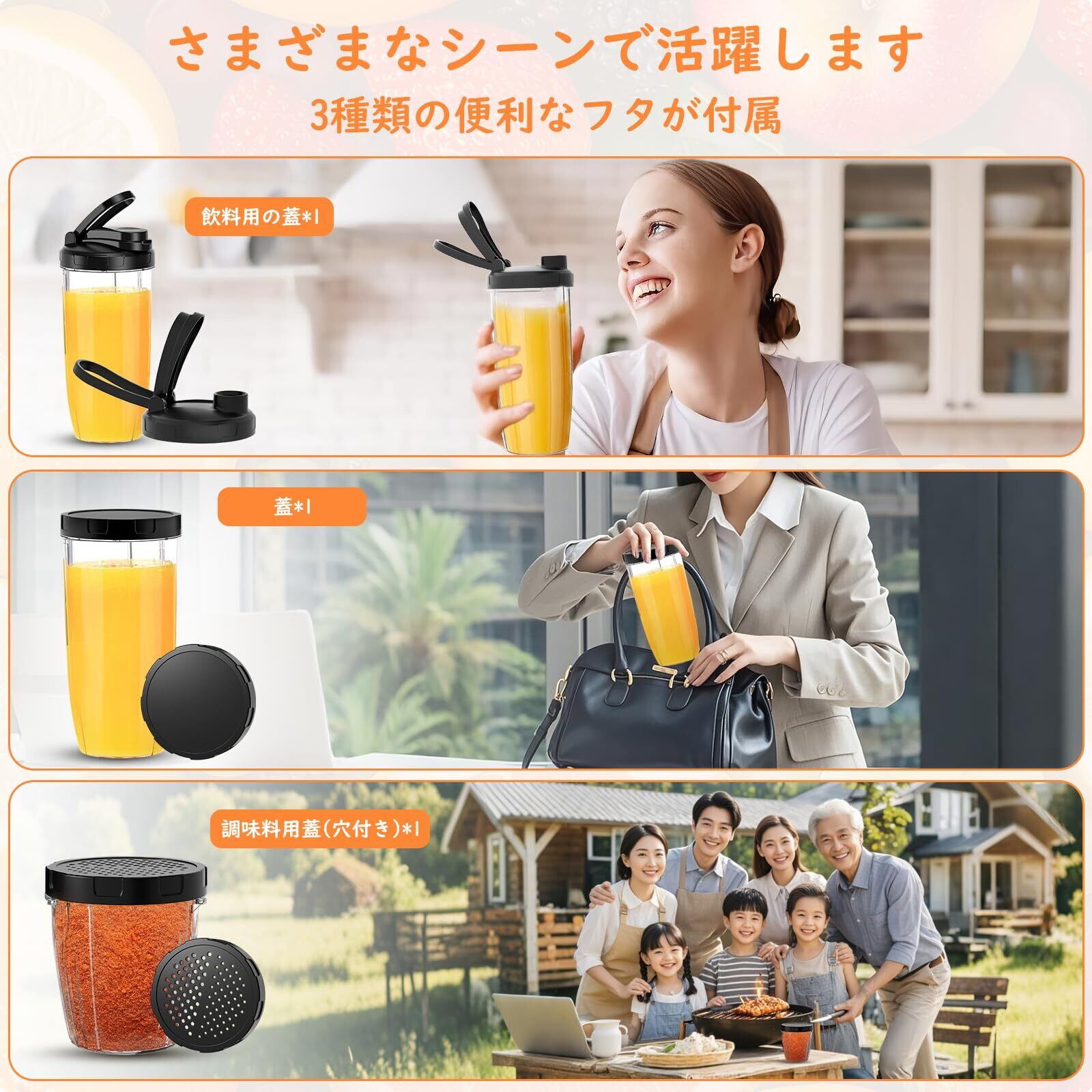 【多機能で簡単操作】ミキサー ジューサーは、氷、果物、野菜を素早く粉砕し、ジュース、スムージー、ミルクセーキ、コーヒー粉、離乳食などを簡単に作ることができます。ワンプッシュの簡単操作で、わずか30秒でお好みの飲み物を手軽に楽しめます。作った飲み物はそのまま飲める設計で、ふた付きの携帯用カップとして、外出先でも手軽に持ち運びが可能です。