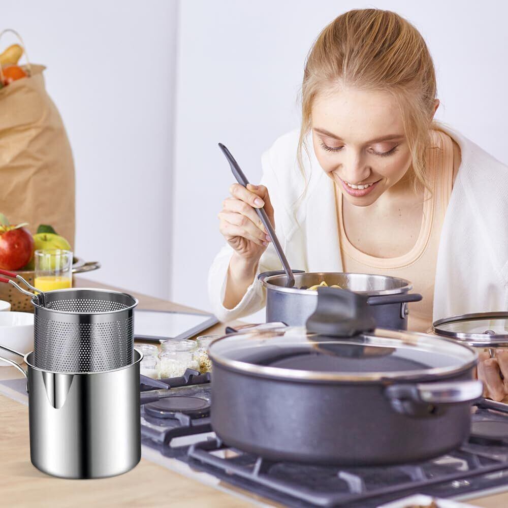 2pcsステンレススチール製フライヤーミニオイル節約多機能小型フライヤーフライドポテトフライヤー麺料理/ホットミルクポットキッチンツールホーム (304ステンレス製フライヤー + 赤ハンドル付きフライバスケット)