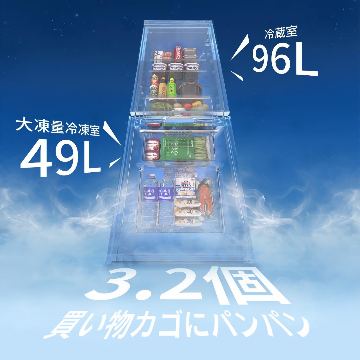 【145Lの大容量】 「一人暮らしでも、すぐに買い物に行けない…」→週一度のまとめ買いにもゆとり対応の145Lの大容量です。 冷蔵96L・冷凍49Lの絶妙なバランス設計。野菜室と冷凍室を独立させた使いやすい収納で、お一人様なら約5日分〜1週間分の食材をまとめてストックできます。 ・週末に買いだめしたお肉や野菜 ・ふるさと納税の食品返礼品 ・作りおきのおかず ・常備したい冷凍食品やアイスクリーム。 食材の「買い忘れ」や「無駄な廃棄」を減らし、スマートな食生活をお手伝いします。