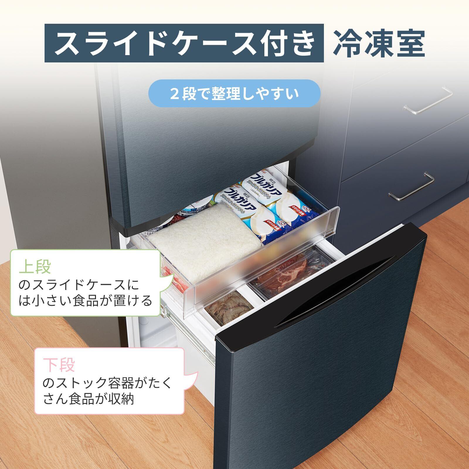 【収納便利なドアポケット&スライド冷蔵室】冷蔵室の3段ドアポケットは2Lペットボトル3本収納可能! 冷凍室は2段スライドケースで小物からストック食材まで整理ラクラク。すっきり収納で使い勝手抜群です。
