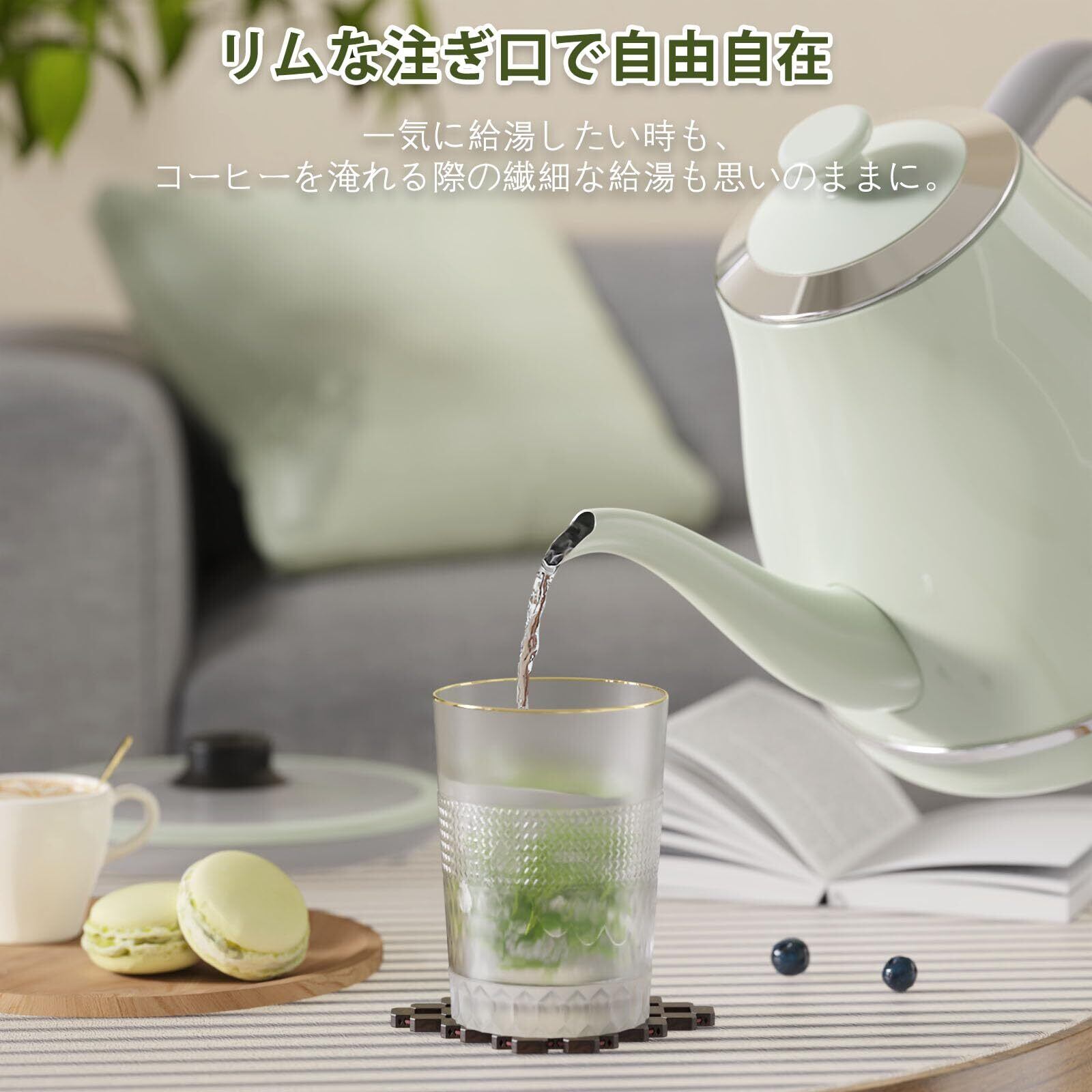 電気ケトル ケトル 電気 ステンレス製 1.0L 1200W (急速湯沸かし/空焚き防止/自動電源OFF) PSE認証済み カップ1杯約58秒 (グリーン)