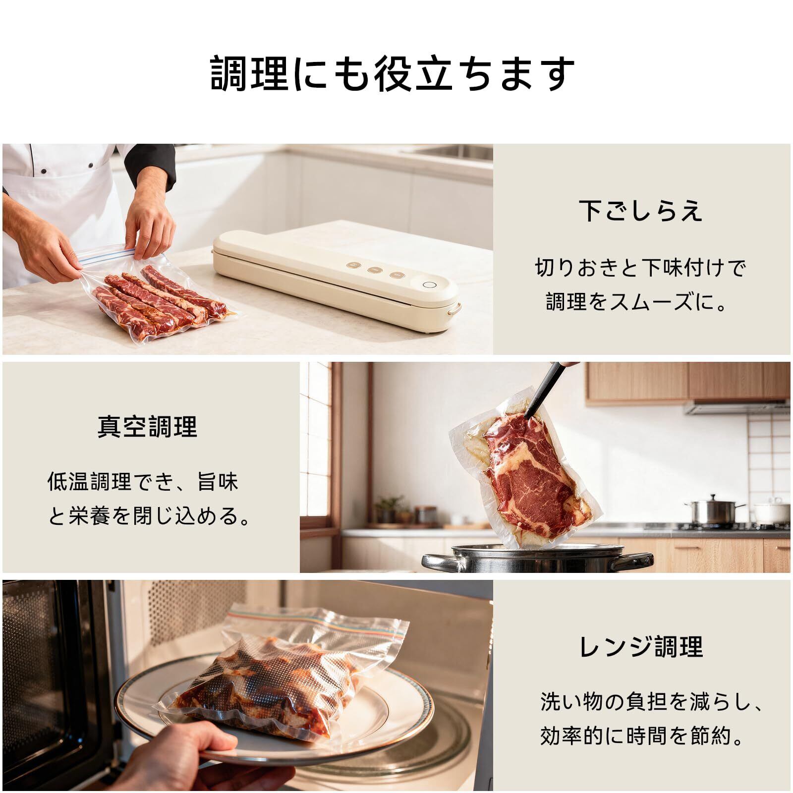 【キッチン・冷蔵庫をスッキリ】真空パックすると、食品は嵩張らず、省スペースだけでなく、食品の匂いが移るのを防ぐこともでき、冷蔵庫やキッチンの整理が容易になります。