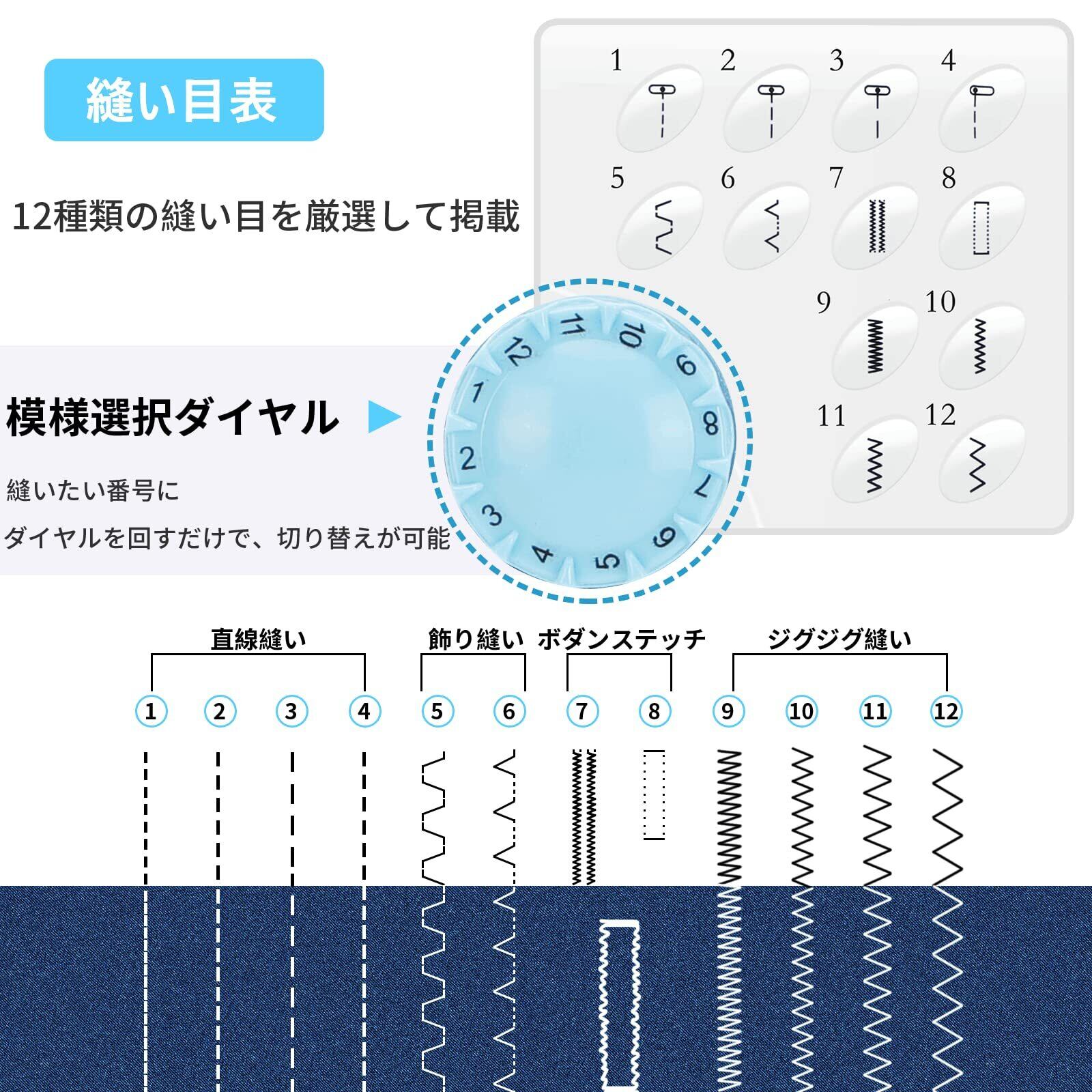 【12種類の縫い目】:地縫い、ジグジグ縫い、まつり縫い、ボタンホール、裾上げの用途に対応し、よく使う12種類の縫い目をダイヤルで回すだけで縫い模様の切替が可能。